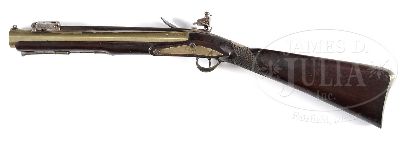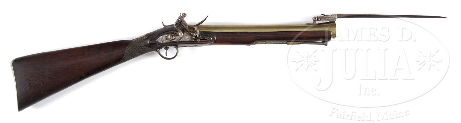 BOYE FLINTLOCK BRASS BARRELED BLUNDERBUSS.SN NSN. Large bore, 13-3/4″ bbl, with attached hinged spring loaded bayonet, original flintlock, checkered stock and brass hardware. CONDITION: Fine condition, bbl shows even mustard colored patina, lock is uncleaned with a roller frizzen, bayonet is original and functions very well. Stock is in very good condition, checkering is sharp, ramrod is present and original. The first scatterguns. 49433-33 TEP C&R (2,500-4,000) – Lot 1180