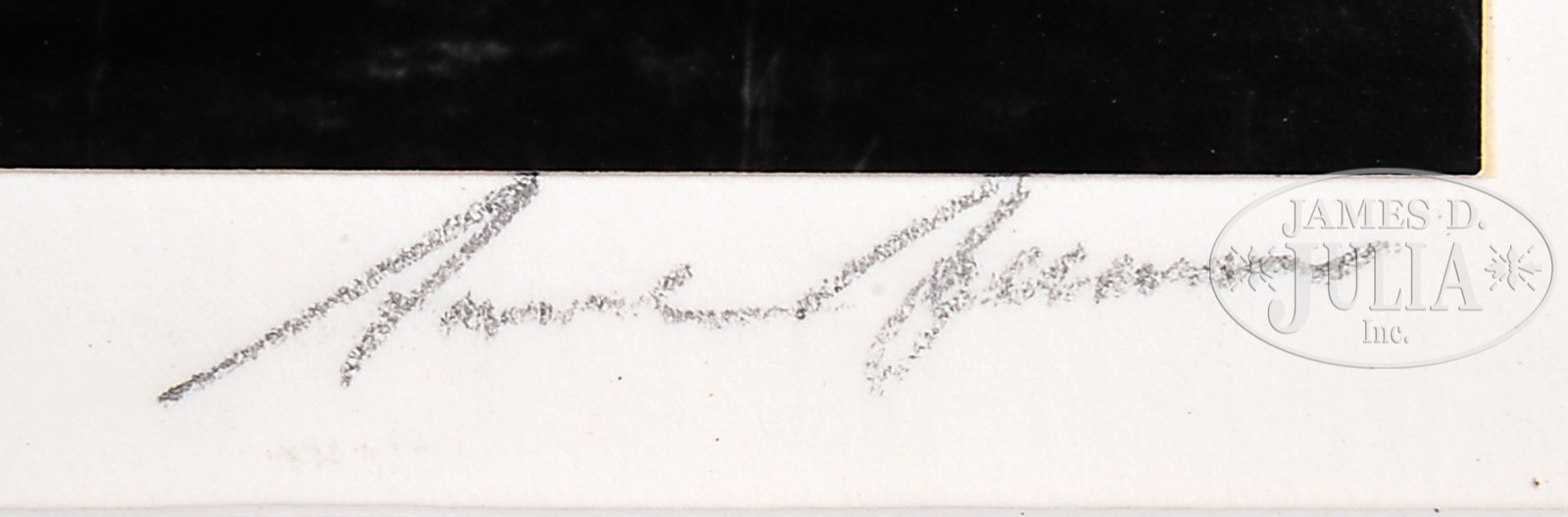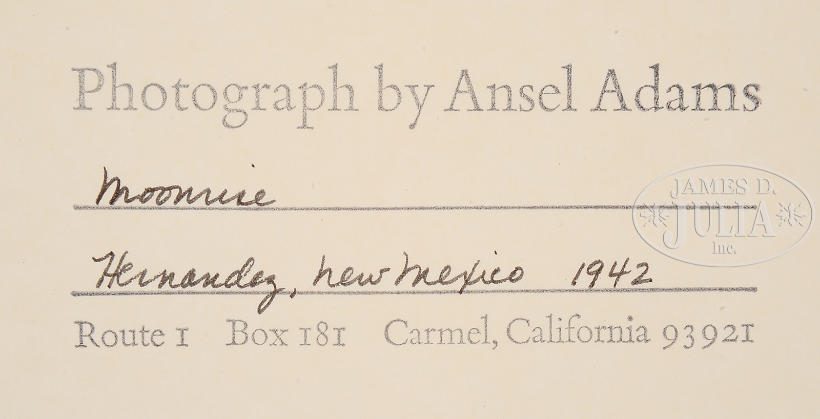ANSEL EASTON ADAMS (American, 1902-1984) “MOONRISE, HERNANDEZ, NEW MEXICO 1942”.Gelatin silver print Signed lower right in pencil on the mount Titled & dated on verso of mount in ink with artist’s Carmel Studio stamp Unframed, matted, behind Plexiglas SIZE: Image: 15-1/2″ x 19-1/4″. Mount: 22″ x 28″ CONDITION: Very good with three very small droplet spots and a few tiny smudge marks 9-94510 (25,000-35,000) – Lot 1181