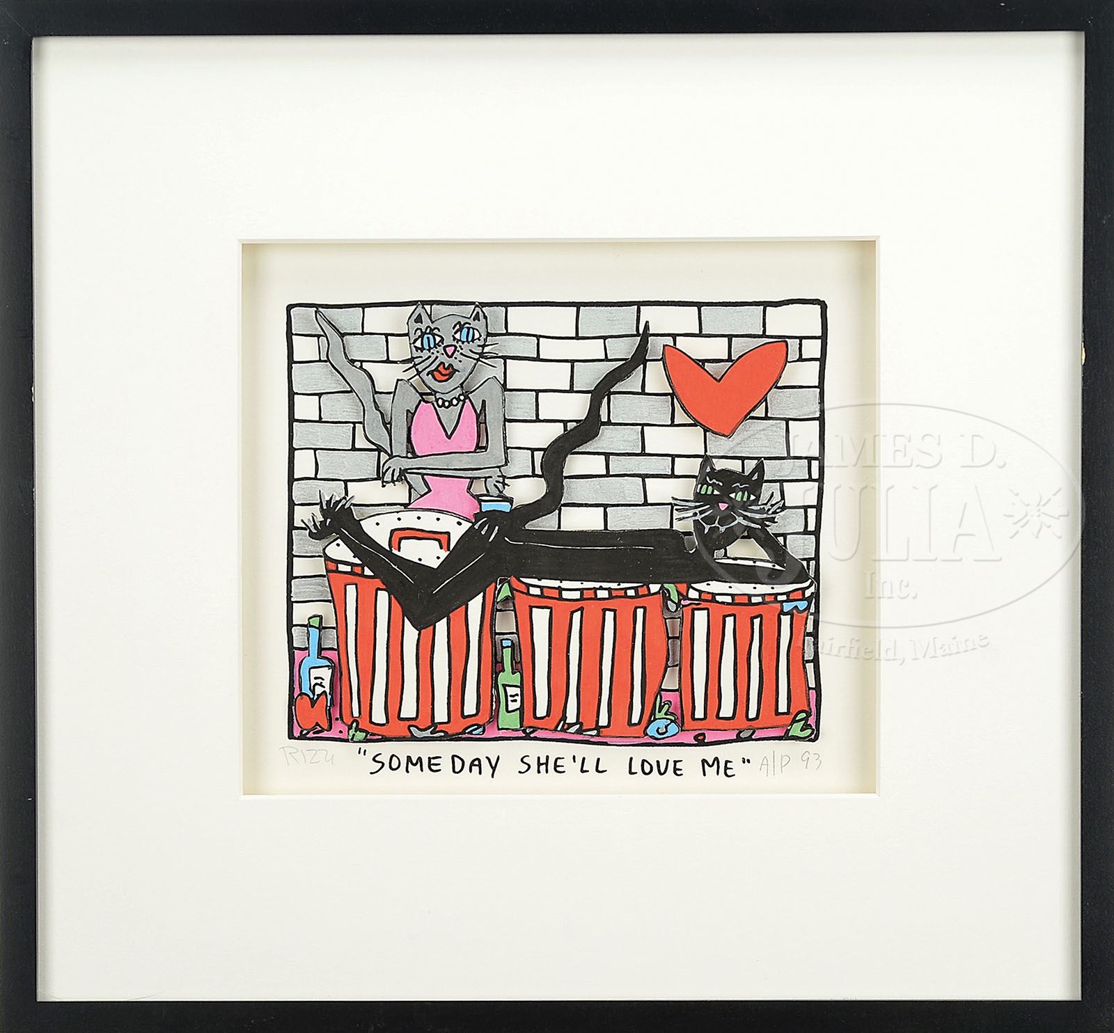 JAMES RIZZI (American, 1950-2011) “SOME DAY SHE’LL LOVE ME”. 3-D Color Serigraph Housed in a black modern frame with white matte Signed lower left in pencil “Rizzi” Lower right “A/P 93″ SIZE: Sight: 7-3/4″ x 9″ Overall: 14-1/2″ x 15-1/2” PROVENANCE: Directly from the family of his assistant, Jenny CONDITION: Very good to excellent 9-91833 (500-1,000)