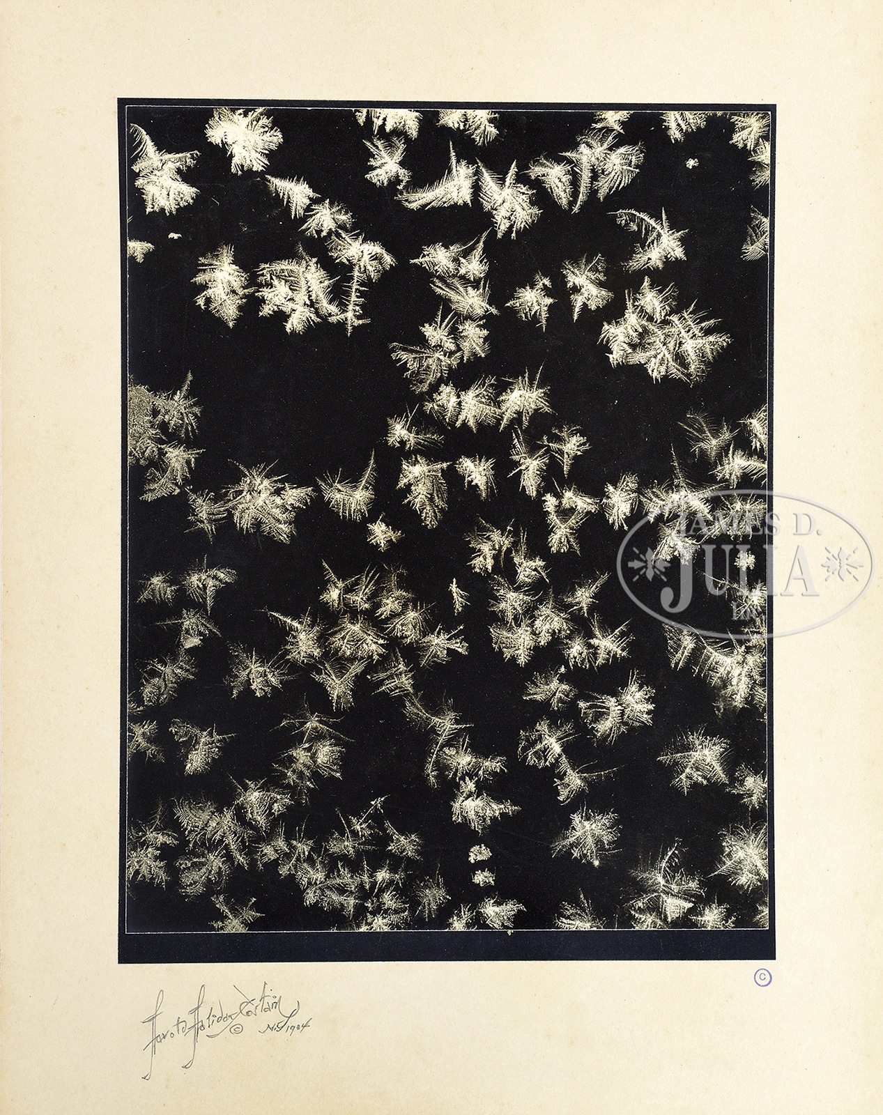 HAROLD HALIDAY COSTAIN (American, 1897-1994) 6 MATTED/MOUNTED MISCELLANEOUS PHOTOGRAPHS.Unframed, 5 mounted & signed, 1 unsigned. 1) Untitled art photo looking skyward past a statue, at a skyscraper. 2) Portrait of Liverpool Hazzard titled “The Last of the Butler Island Slaves, 107 years old, 1937, Darien, GA. 3) “Frost Crystals on a Window Sill, Portland, ME 1920”. 4) “Avery Island Salt Mine”. 5) Untitled Fireworks. 6) Untitled portrait of Mr. Hazzard, 107 years old. 5 with artist stamp on verso. 3 titled on verso. SIZE: Image: 2 are 13-1/4″ x 10-1/2″; 1 is 9-1/4″ x 7-1/2″. CONDITION: Mat on fireworks photo severely damaged, others with minor nicks and wear with toning. Photos very good. 9-93074 (600-800) – Lot 1183