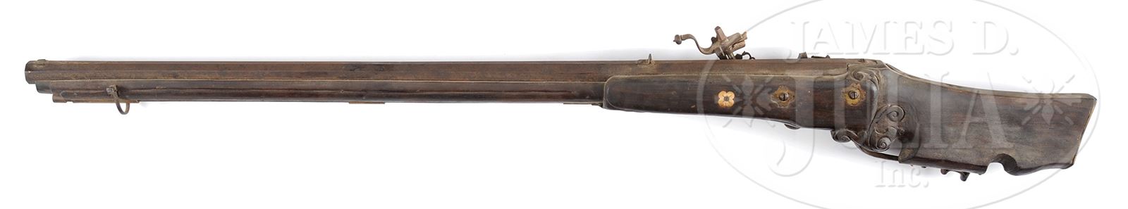 EUROPEAN WHEELOCK.SN NSN. 44″ overall with 37″ oct bbl with small European proof on top of bbl. Carved stock, iron & brass mounted with bone inlays. Accompanied by wood-handled crank. CONDITION: Good to very good overall. Appears complete & functional. 49433-40 JS (3,000-5,000) – Lot 1183