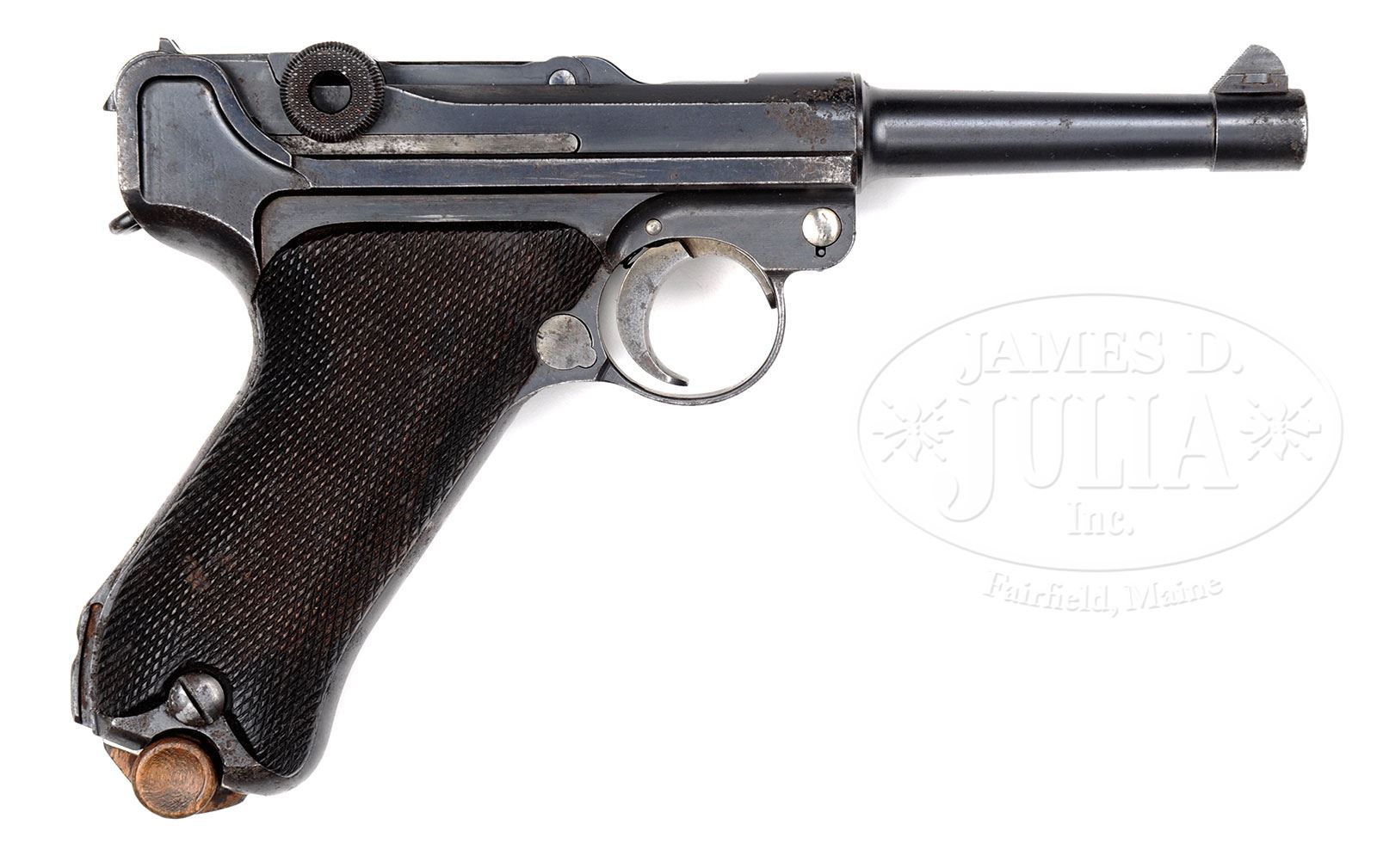*◊ 1934 -v RANGE VERY EARLY MAUSER SMALL BARREL TRADE MARK OBERNDORF COMMERCIAL LUGER.SN 1574V. Cal. 9mm. 4″ bbl with 4-digit SN and Mauser Crown/U proof on bottom. First pattern small Mauser barrel on center toggle link. Crown/U proof on front toggle link. Matching SN on back of rear toggle link. Crown/U on left receiver. Front and center links and sideplate are unnumbered. Receiver and sear bar are also unnumbered, as are the checkered walnut grips. Full V-range SN on front of frame. Plain wood bottom mag. Distinctive long (16.89 mm) muzzle band and set-back foresight bed only seen on very early 1934 commercial and mid-K date range military pistols indicating start of Mauser manufacture of Luger barrels. This gun is featured on pp. 539, 540, 612, 748, 769 and 1110 of Borchardt & Luger Automatic Pistols by Joachim Gortz and Dr. Geoffrey Sturgess. PROVENANCE: Collection of Dr. Geoffrey Sturgess. CONDITION: Very good, retains 90% blue with scattered corrosion overall with pitting on sides of muzzle, right front corner of receiver, right front frame rail and gripstraps. There is also pitting underneath the grips. Retains 35% straw with scattered corrosion and takedown lever has a few dings. Grips are lightly worn and oil soaked dark. Chip in lower front corner of left grip. Mag has chips on wood bottom and scattered light pitting on body. Bore is worn and lightly pitted. Mechanics are sound. 4-52816 BWS18 (2,500-5,000) – Lot 1184