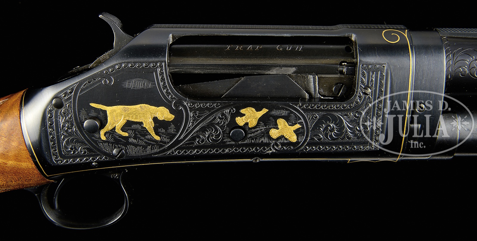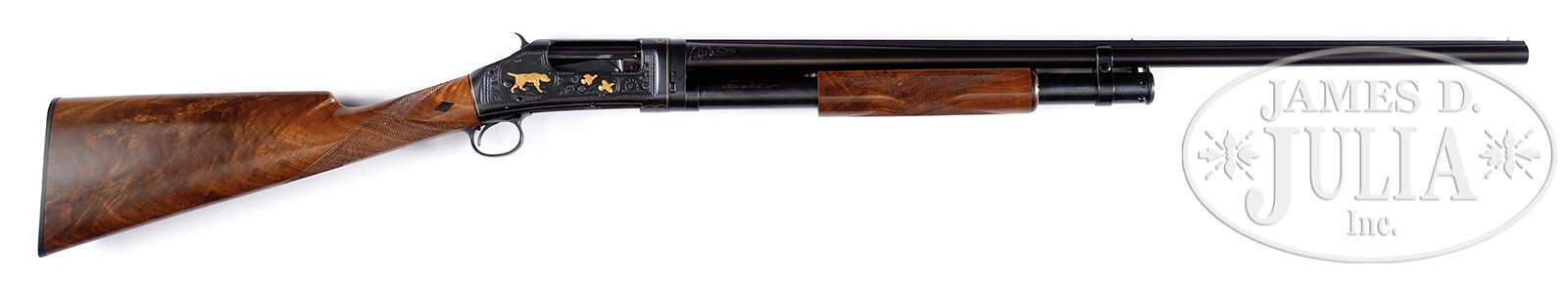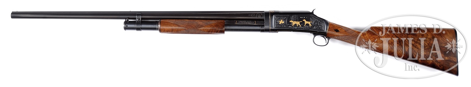 *ABSOLUTELY STUNNING GOLD INLAID WINCHESTER MODEL 97 CUSTOM BLACK DIAMOND STYLE 20 GAUGE SHOTGUN.SN E869752. Cal. 20ga. Marked 2-3/4″ chamber, 28″ bbl with solid matted rib. Silver tone front bead with brass mid-bead. Bbl marked FULL choke. Scroll engraved wedges at bbl breech. Bbl marked “MODEL 1897” ahead of Winchester trademark marking. Right side of bbl is marked with Winchester address and patents. Proof mark on left side of bbl rib and left side of receiver top matting. Trap Grade style forend with prominent figure. Checkered in diamond pattern. Forend slide bar is marked “MODEL 1897 WINCHESTER” with trademarks and is enclosed by two gold inlaid parentheses. Takedown pump action. Bolt is marked “TRAP GUN”. Checkered hammer. Receiver has been treated to fantastically executed engraving. Left side gold inlaid flying grouse with two gold Pointer hunting scene. Game scene surrounded by foliate scroll with full scroll work around border of receiver side. Receiver borders have been inlaid with fine gold wire. Right side of receiver has wonderful game scene with gold Pointer and two flying gold grouse, again, with foliate scroll and border engraving. Straight grip feather crotch highly figured stock with black diamond inlays on right and left side at grip. Fluted comb. Winchester marked buttplate. PROVENANCE: The Jon Roark Collection. CONDITION: Extremely fine. This gun is in nearly new condition after its stunning upgrade. High quality factory type rich blue is retained on nearly all surfaces of this gun’s metal work with only the slightest wear to forend slide bar. Bbl and magazine tube show nearly all finish. Some blue loss on magazine tube from sliding the forend. The most tiny marks on left front edge of receiver from takedown reassembly. Minor blue loss on bolt edge from travel. The highly finished stock and forend retain all professionally applied satin gloss finish. Checkering is perfectly sharp and wonderfully executed. Buttplate is in pristine condition. This gun operates smoothly and as it should. An absolutely exquisite 20ga Winchester Model 97 shotgun. 50387-21 TJW (5,000-7,000) C&R – Lot 1184