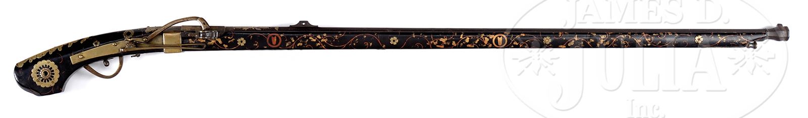 ELABORATE JAPANESE MATCHLOCK WITH BRASS, SILVER & COPPER BARREL INLAY.SN NSN. 50 Cal. Gun measures about 52″ overall with 40″ oct bbl with swelled muzzle. Stock is painted over black enamel. Brass & silver inlays are found in wood, including small birds. Brass & copper inlays in bbl include bamboo, grapes & leaves and a silver squirrel. PROVENANCE: Rod Fuller Estate Collection. CONDITION: Good to very good overall. Gun is complete and orig with some blockage, possibly old charge in chamber. Gun appears complete & functional. 49291-36 JS (2,000-3,000) – Lot 1185
