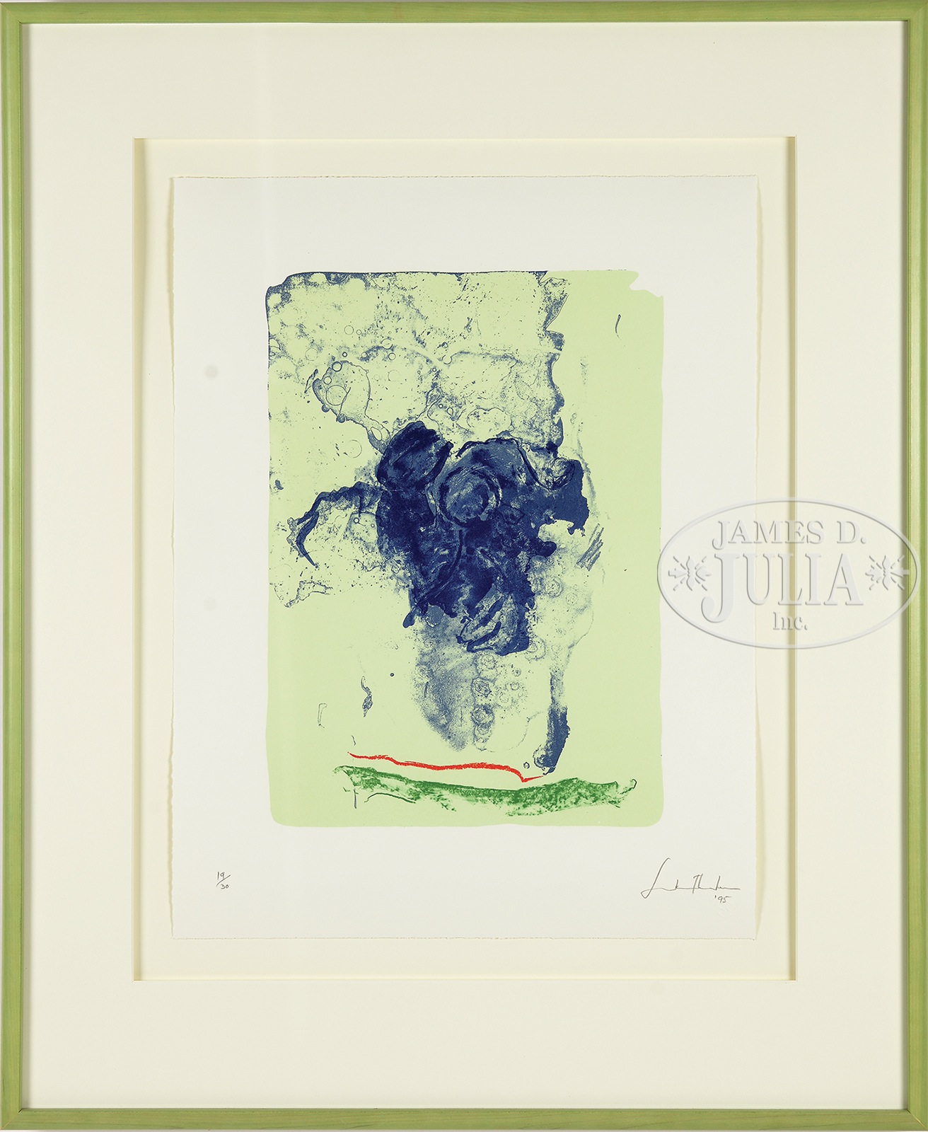 HELEN FRANKENTHALER (American, 1928-2011) REFLECTIONS XI.Color lithograph Housed in a contemporary frame Signed and dated lower right “Frankenthaler,” blind stamped and numbered 19 of edition of 30 SIZE: Sheet 19-1/2″ x 15″. Overall 29-1/2″ x 24″ CONDITION: Overall good, colors slightly faded, float mounted- entire margins visible- not examined out of frame 9-96236 (1,000-1,500) – Lot 1187