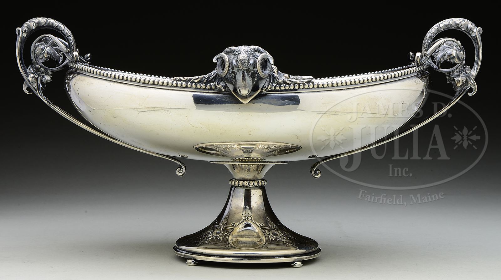GORHAM STERLING SILVER CENTER BOWL.Gorham footed center bowl has round tapered base resting on sterling silver wafer feet and supports oval bowl which is mounted with cast sterling silver Rams head on either side with swirling leaf handles at each end. Top of bowl is finished with beaded border. Bowl has what appears to be an engraved coat of arms with center shield with crescent moon with star and rope above and banner below reading “Spectemure Acendo”. Marked on underside with Gorham sterling hallmarks. SIZE: 13-3/4″ w x 7-1/8″ t. CONDITION: Very good to excellent with some minor scratches to interior. 50280-10 (1,500-2,500) – Lot 1187