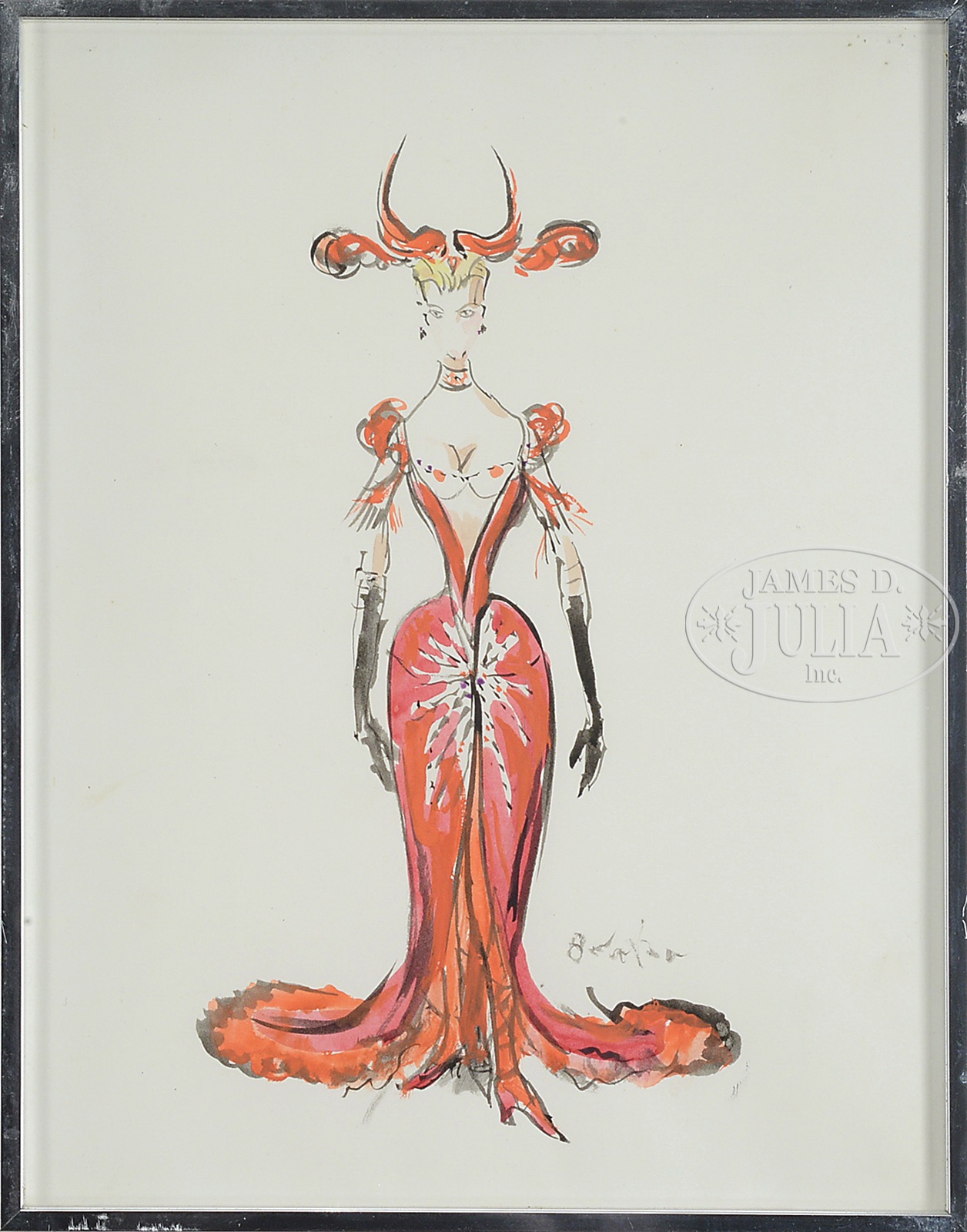 CECIL WALTER BEATON (American/English, 1904-1980) THREE COSTUME ILLUSTRATIONS.Watercolor and ink on paper, All three housed in chrome frames, under glass. 1) Elegant Lady in Red Dress (possibly from My Fair Lady), Signed lower right “Beaton”. 2) Dapper Gentleman in Green Suite Holding a Drink, Unsigned. 3) A Couple at the SHore Wearing Blue Bathing Costumes. Unsigned, inscribed on foam core backing “Tenderloin (2) Rev. Brock-Maurice Evans no jacket- lt. blue (off-white) jersey instead. (63)1 as girl- Siamese”. NOTE: “Tenderloin” was a musical starring Maurice Evans with sets & costumes by Cecil Beaton SIZE: Overall 14″ x 11″ CONDITION: 1) Very good. 2) With two small spots of discoloration upper right corner. 3) Very good. Not examined out of frames 51203-6 (3,000-5,000) – Lot 1187