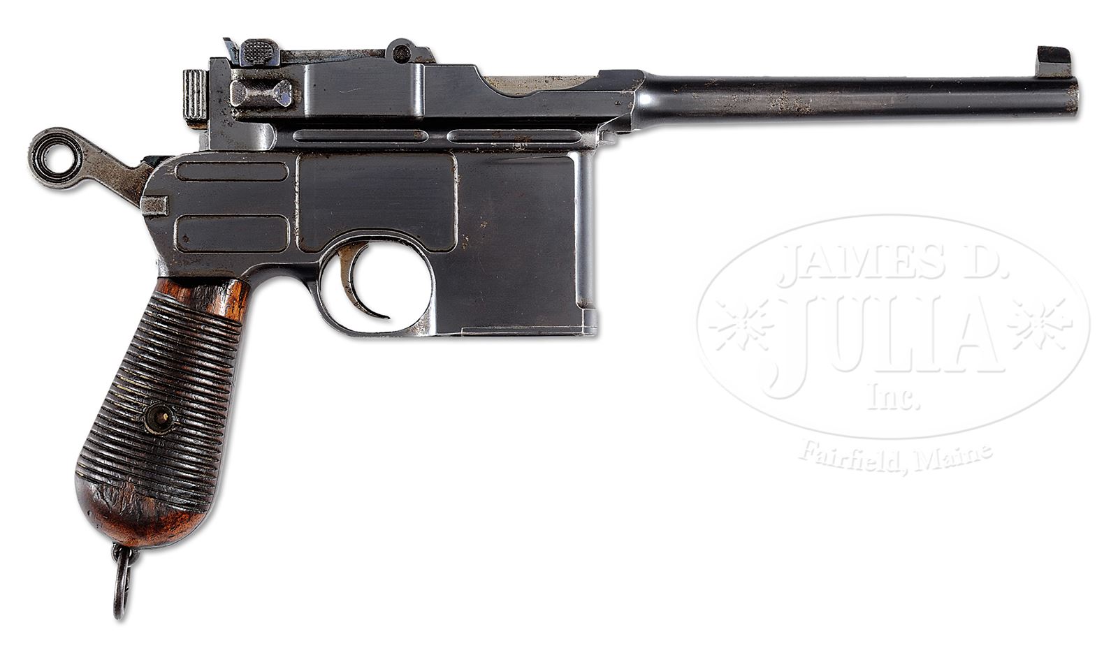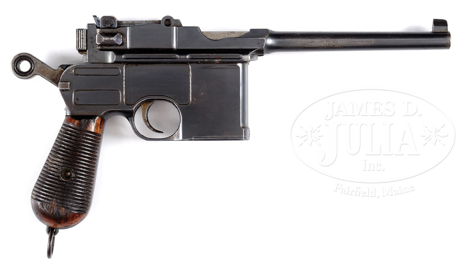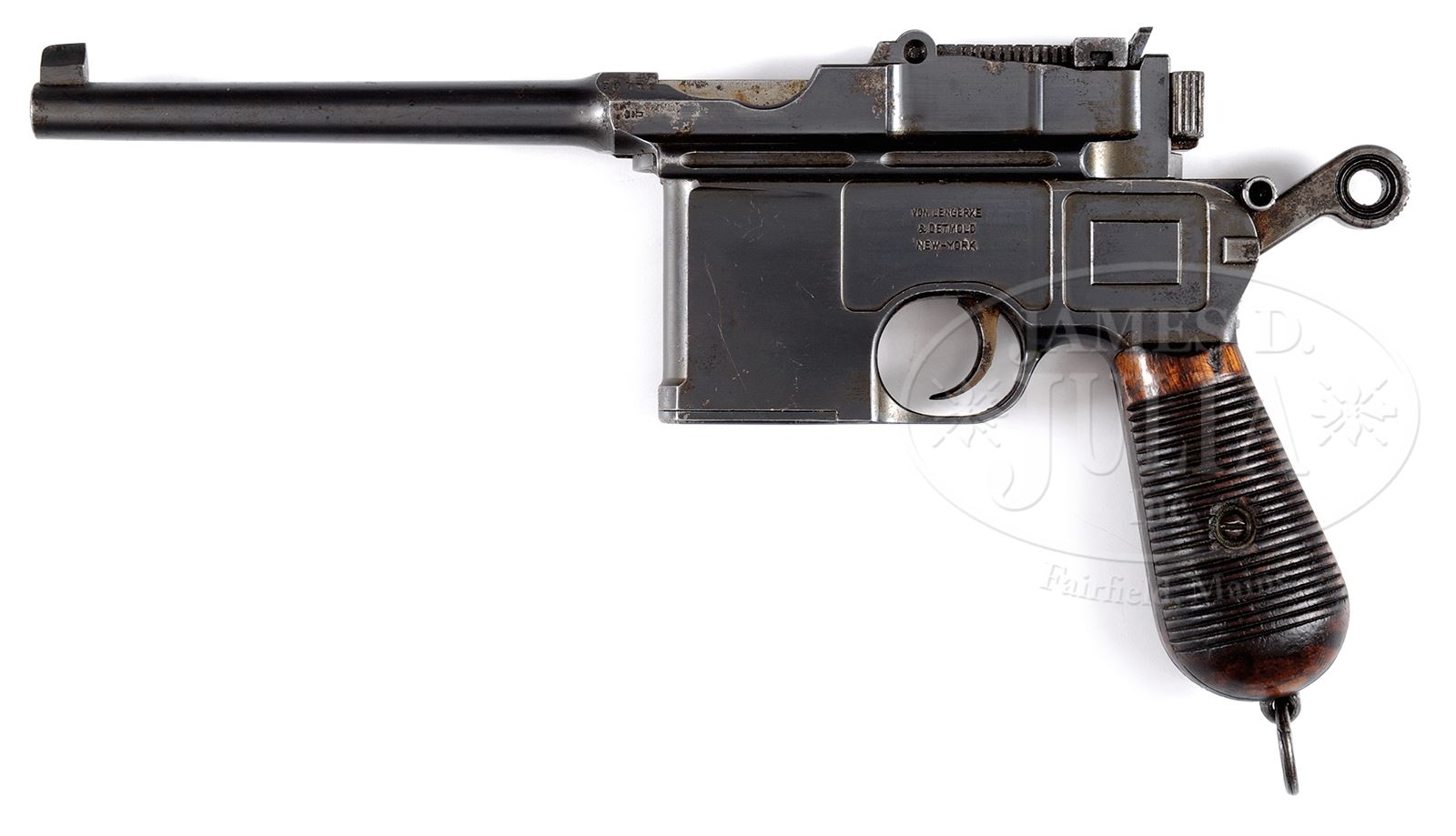 *MAUSER MODEL C-96 COMMERCIAL PISTOL.SN 30722. Cal. .30 Mauser. 5-1/2″ bbl, blue finish. Finely ribbed wood grips. CONDITION: Very good, pistol retains 75% of the original finish with roughness at the breech end of the bbl and left side of the frame. Some roughness on tangent sight and on the right side of the bbl also at the muzzle. This is an early version of the C-96 Mauser with a large ring hammer, the left side of the receiver stamped “Von Lenderke & Detmold New York.”. Grips are good with some marring on the right side. All visible SN’s match. Nice early commercial C-96. 49433-71 TEP C&R (3,000-4,000) – Lot 1189
