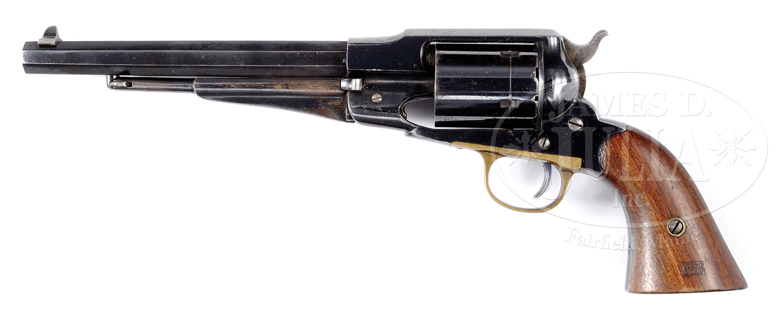 SCARCE REMINGTON NEW MODEL ARMY FACTORY CONVERSION REVOLVER WITHOUT EJECTOR.SN 142259. Cal. 46 RF. Blue finish with 8″ oct bbl, standard dovetail front sight with fixed groove rear sight in the top strap. Top flat of bbl has the 3-line address including “NEW-MODEL”. Bottom flat of bbl is marked with the SN along with the factory conversion number “4516”. Matching conversion number is found on left side of front strap under the grip and the number “101” is on left side of backstrap under the grip. Right side of the backstrap under the grip is marked “4416”, obviously an assemblers mistake. The 5-shot cylinder has the Rollin white patent date horizontally on the outer circumference. Mounted with smooth 2-pc walnut grips pencil numbered to this revolver inside right grip. Left grip has a crisp cartouche and there are various small inspector initials on the revolver. The 1858 New Model Army was an extremely popular revolver during the Civil War and few survive today with high orig finish. PROVENANCE: George McAllister Collection. CONDITION: Extremely fine plus, appears to be unfired. Bbl retains about 95% strong orig blue with muzzle end and sharp edge wear. Rammer handle retains about 60% orig blue with the loss areas from flaking, not wear. Frame & grip frame retain about 96-97% glossy orig blue with only very faint sharp edge wear. Hammer retains most of its orig case colors, slightly muted. Cylinder retains about 90-92% glossy orig blue with some edge wear and minor spots of flaking. Trigger guard is a dark mustard patina. Grips show edge wear and retain most of their orig oil finish. Mechanics are crisp, brilliant shiny bore. 51669-1 JRL (6,000-10,000) – Lot 1189