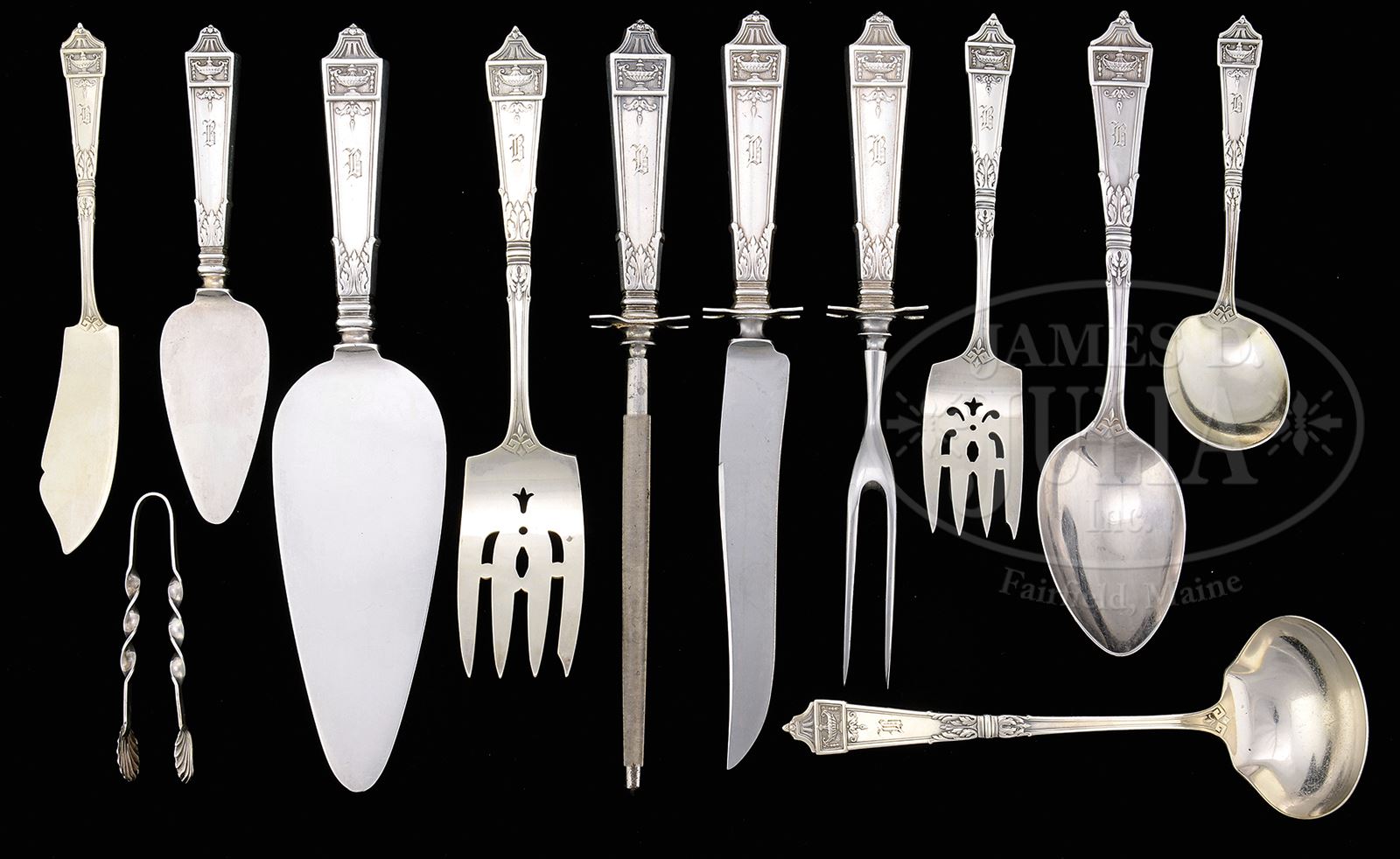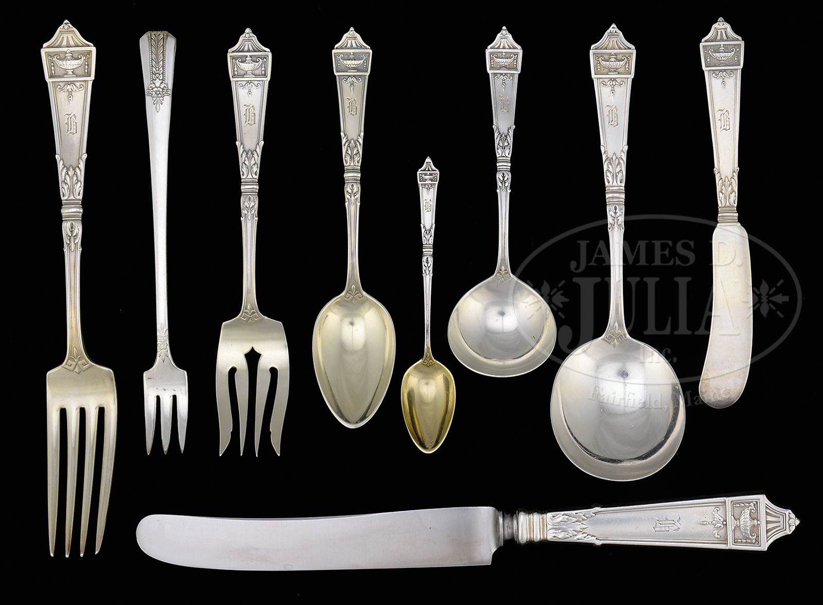 GORHAM STERLING SILVER FLATWARE SET.Gorham Sterling silver flatware set in Lansdowne pattern consists of nine dinner forks, nine salad forks, nine dinner knives, six soup spoons, nine bullion spoons, seventeen teaspoons, eight butter spreaders, six demitasse spoons, one meat fork, one salad spoon and fork, one ladle, one cake knife, one small cake knife, one small serving fork, one carving knife and fork with sharpening steel, one small serving spoon and one master butter knife. Each piece is monogrammed with “B”, and marked on backside “Gorham Inc” along with Gorham hallmarks “Pat. 1917 Sterling”. Set is accompanied by wooden box. There are also several silver plated non-matching pieces in box along with Sterling handled carving knife and small Sterling silver sugar tong. SIZE: Weight is approx 75 troy oz; not including knives, carving set and cake knives. CONDITION: Very good to excellent. 50344-1 (1,000-1,500) – Lot 1190
