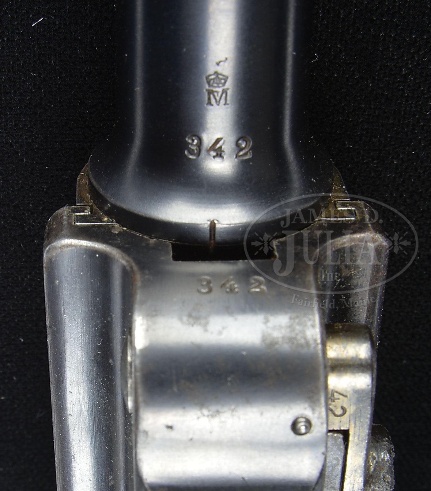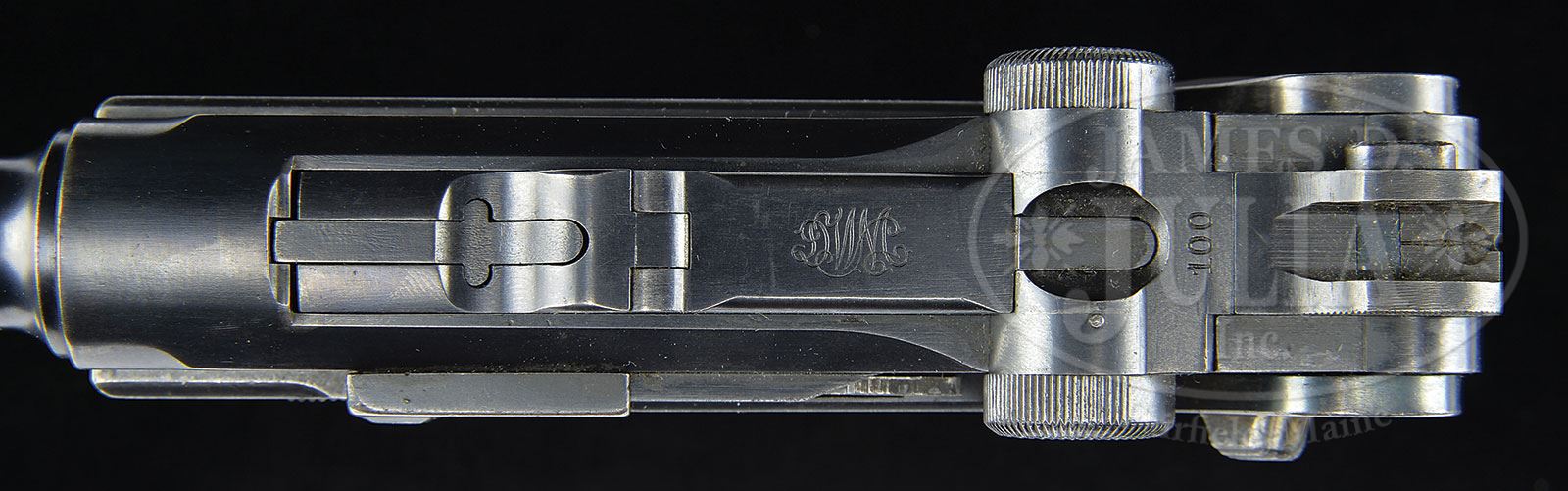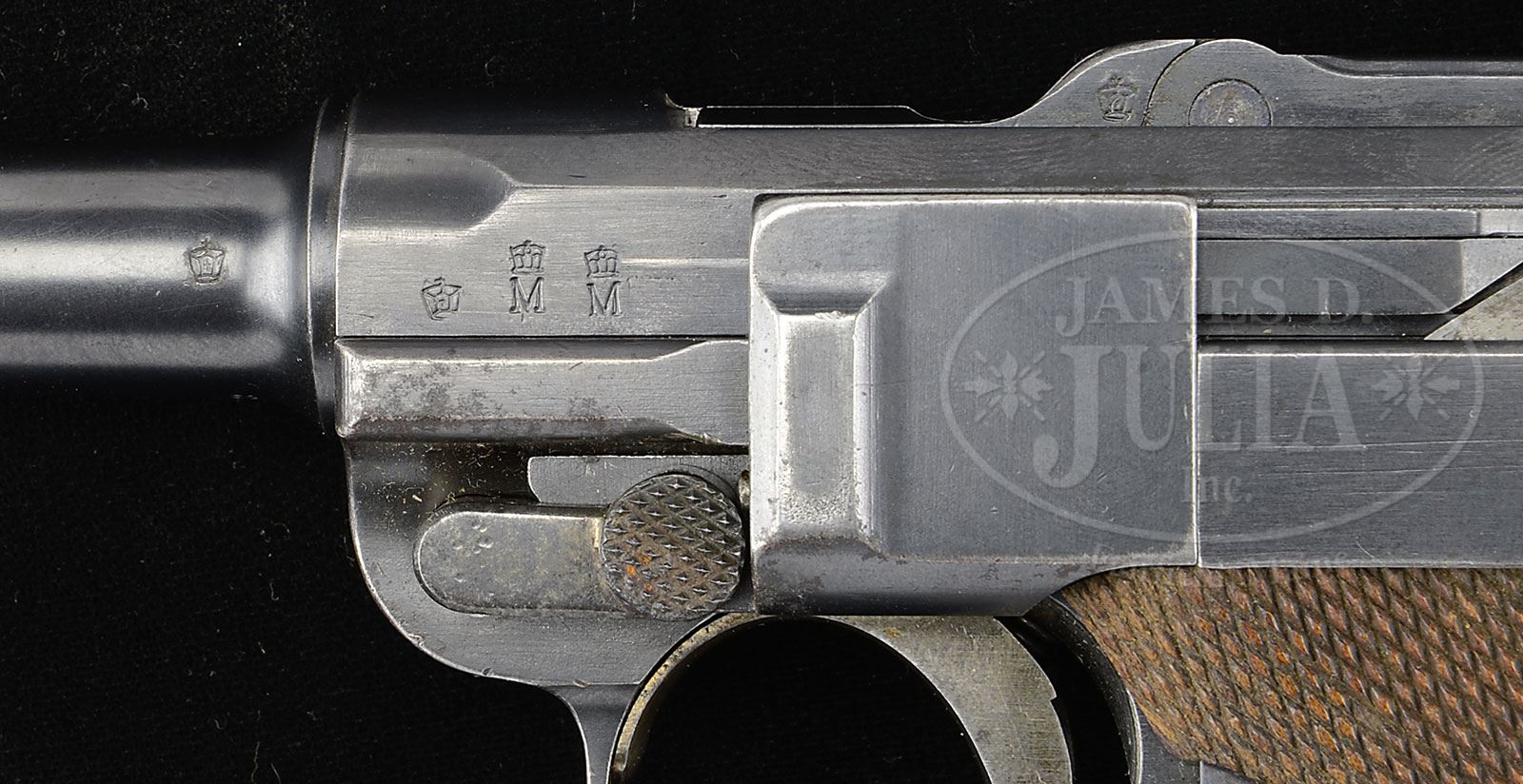 *◊ VERY EARLY THREE DIGIT KIEL DOCKYARD UNIT MARKED DWM 1906 NAVY FIRST ISSUE ALTERED LUGER.SN 342. Cal. 9mm. 6″ bbl with full SN and Crown/M proof on bottom and Imperial Crown on left side. Ringed chamber. DWM scroll on center toggle link. 100/200 meter adjustable Navy rear sight on rear toggle link. Rare earliest pattern New Model toggle grips which have no lower inside edge lead-in taper to the bottom of the slots of the finger grip (tapered after sn 400 to assist closing over the upper edge of receiver rail). Breechblock has Imperial Crown proof. Left side of receiver has Crown/M proofs (with early trip-lobe crown rather than later pentagonal crown) and Imperial Crown proof. Full 3-digit SN on front of frame. GESICHERT removed from lower safety position and stamped in upper position with safety lever mechanism altered accordingly. Grip safety. Rear grip strap is stamped “W K/8180” (Dockyard Kiel, weapon number 8180). All numbered parts on gun are matching, including matching numbered checkered walnut grips. Proper Crown/M mag with concentric ring wood bottom has numbers that do not match. This gun is featured on pp. 272 and 903 of Borchardt & Luger Automatic Pistols by Joachim Gortz and Dr. Geoffrey Sturgess. PROVENANCE: Collection of Dr. Geoffrey Sturgess. CONDITION: Very fine, retains 95% orig blue with normal wear to sharp edges and corners and light pitting on left side of bbl, left frame rail, grip straps, grip safety and above left grip (common on guns that were around salt water). 60% straw with scattered corrosion. Grips are lightly worn with nice color. There is a chip below the safety on the left grip. Mag is excellent with a few minor dings on bottom. Bore is sharp with some frosting. Mechanics are excellent. 4-52901 BWS23 (5,500-8,500) – Lot 1191