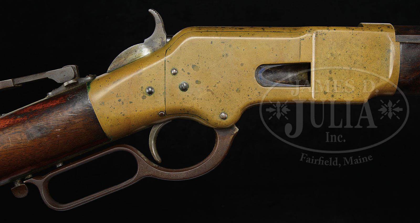 SCARCE HENRY MARKED 2nd MODEL WINCHESTER MODEL 1866 LEVER ACTION RIFLE.SN 15972. Cal. 44 RF Henry. Standard rifle with 24-1/4″ oct bbl, full magazine with screwed-in plug and 2nd type magazine band. Front sight is blued steel with a 900 yard Henry ladder rear sight and an attached windage adjustable sporting tang sight. Mounted with uncheckered straight grain American walnut with straight stock and crescent brass buttplate with trap containing an orig 4-pc brass & iron wiping rod. Forend cap is also brass with dimpled front edges and integral sling wire with matching sling wire on the stock. Serial number is found on left side of lower tang under the wood, in top tang channel of buttstock and inside toe of buttplate. Bottom tang is also marked with the initials “RV” and a small “W”. Top flat of the bbl has the Henry’s & King’s 2-line Patent markings. The 2nd Model ’66s had flared front edges on the receiver to allow for a thicker forearm, which had been a much maligned fault on the 1st Models. In addition, the loading gate on the 2nd Model and subsequent models had tapered concave grooves instead of the flat loading gate of the 1st models. Receivers of the 2nd and subsequent models were also more streamlined at the top rear edge with a sloping radius instead of the sharp Henry-style radius of the 1st Models. This rifle appears to have been produced in 1868 at the height of the post-Civil War Westward Migration when any repeating cartridge firearm was in tremendous demand. Those firearms usually saw extreme hard service under very harsh conditions and are rarely found today with any orig finish. This is a completely untouched and orig ’66 rifle. CONDITION: Very fine, all matching. Bbl & magazine tube retain 60-70% orig blue with the balance mixed patina; receiver & sideplates show slightly worn edges and retain a dark mustard patina with some minor chemical spotting and green verdigris; hammer retains faded case colors on the sides with dark colors on the rear edge; lever is a dark brown patina; tang sight retains traces of orig blue; buttplate is a matching dark mustard patina. Stock has a hairline crack through the bottom buttplate screw hole, otherwise wood is sound with usual nicks, dings & scratches; buttstock retains about 60% orig varnish and the forearm about 40%. Mechanics are crisp, strong dark bore with sharp rifling. Cleaning rod shows heavy use. 4-54020 JR4 (15,000-25,000) – Lot 1192