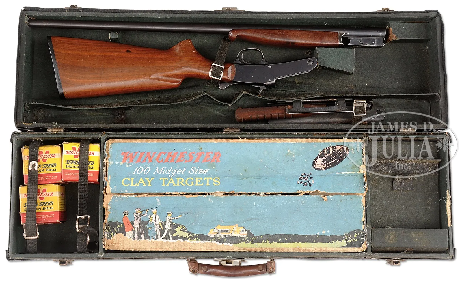 *RARE WINCHESTER MODEL 20 JUNIOR TRAP SHOOTING OUTFIT.SN 406. Cal. 410 ga. This rare set contains a Winchester model 20 single bbl shotgun that has a full 26″ choke bbl with brass bead and standard markings. 2-1/2″ chamber. Walnut buttstock with uncapped pistol grip and snap on schnable tip forearm. Winchester marked hard rubber buttplate. Accompanied by orig black fiberboard carrying case with green oilcloth lining. Included is a Winchester “Midget Hand Trap” with wooden handle. Three full boxes of Winchester Super Speed 2-1/2″ .410 shot shells in yellow and red boxes. One box skeet load #9’s and two boxes #5 shot. In large bottom compartment of case is an orig Winchester picture box for 100 midget size clay targets with nice graphics on top and complete end labels. There are nine miniature targets marked Mossberg/Targo. Partial pad of orig Winchester score sheets and trap shooting outfit description brochure. PROVENANCE: Estate Collection of Jim Baldwin. CONDITION: Good. Bbl retains its orig blue which is beginning to brown, areas of thinning and wear from use. Bright bore. Receiver has much of its orig bright factory blue with wear at high edges and handling marks from use. Small scratches and dings. Trigger guard is toning to brown patina. Stock and forend with orig factory finish. Small bumps and bruises on forend. Buttstock is nicer than average with scattered handling marks commensurate with use. Buttplate is excellent. Gun is tight. Mechanics good. Forend latch weak. Exterior of case is about average for age. All hardware is present and oxidized. Brown leather-wrapped handle may be replacement but has age. Interior compartments are good with some deterioration to areas of lining. Top lid divider slightly out of shape. Interior straps are good with one loose in right side compartment. Shell boxes are sound, slightly dirty and show case wear. Clay target picture box is good with edge soiling and is missing small portions of its label. Hand trap in fair condition with oxidation on metal, handle very good. Pad of score sheets have yellowed and some separated. Brochure oil soaked and creases separated. 50975-16 TJW (3,500-5,000) C&R – Lot 1192