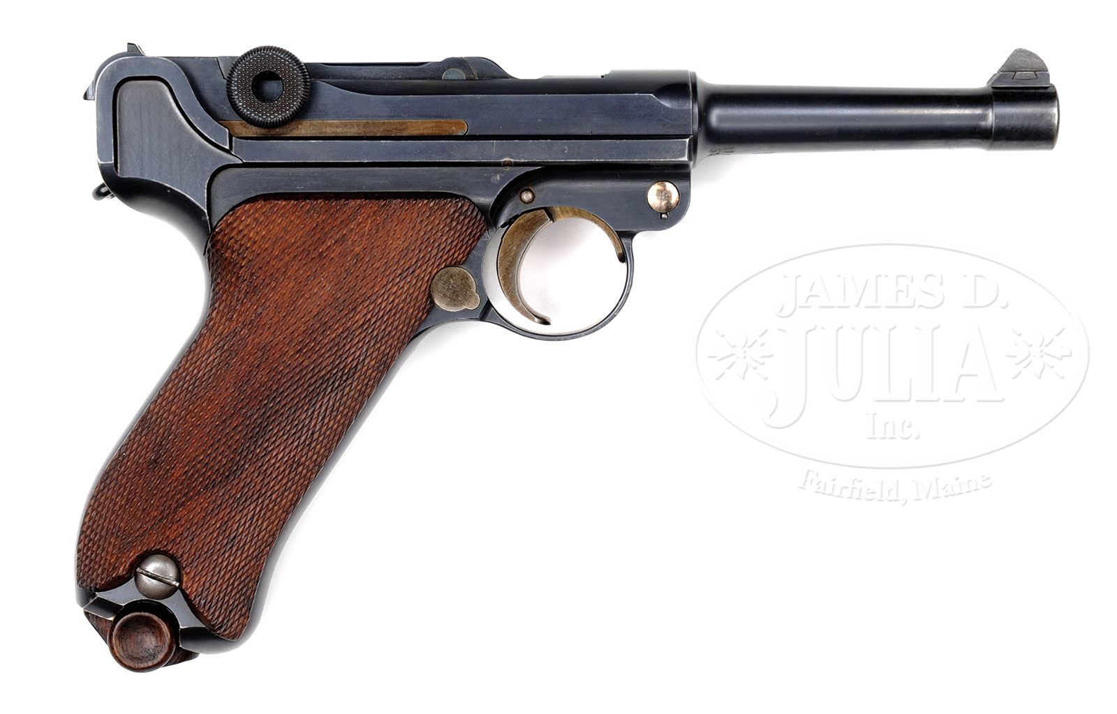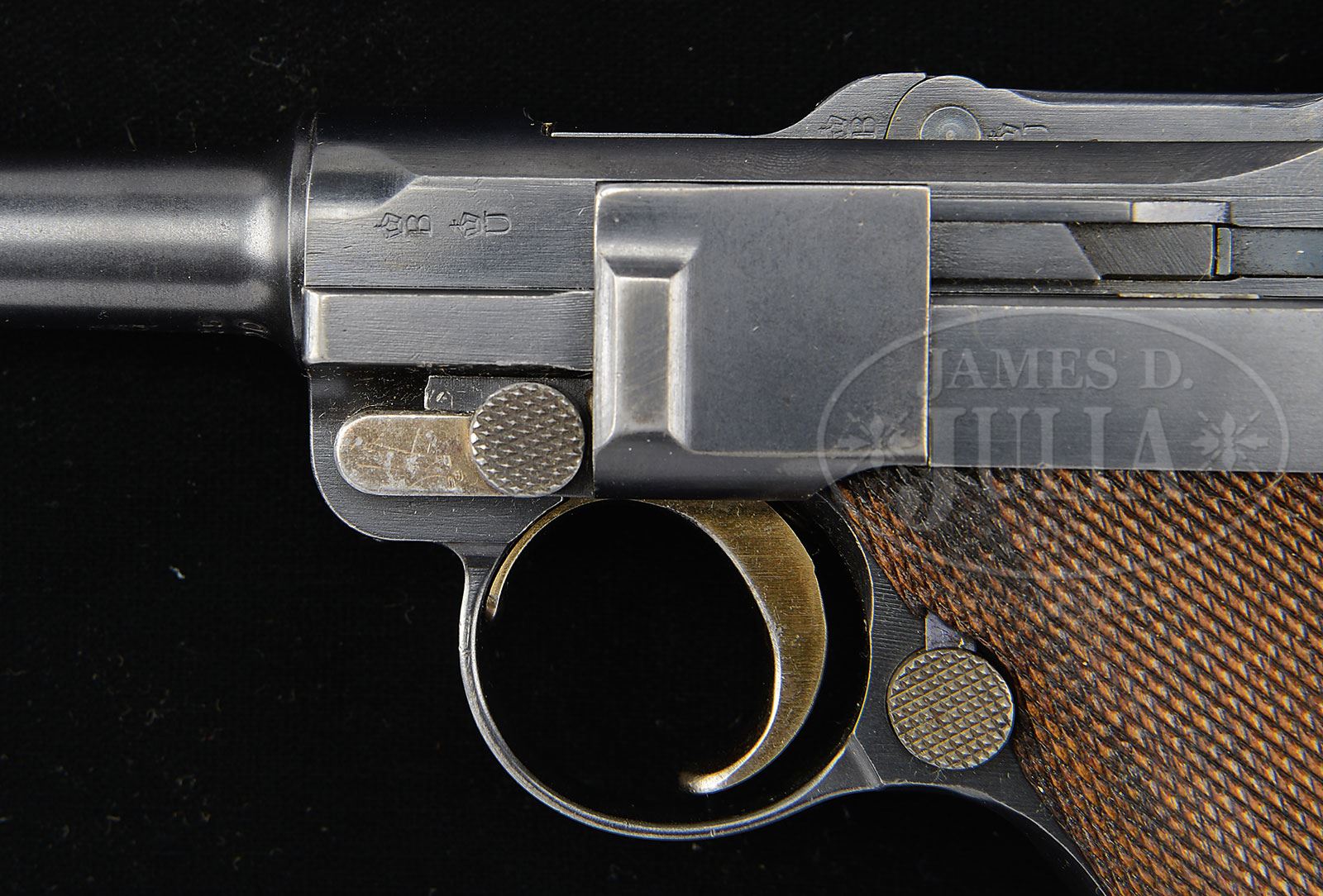 SN 51000. Cal. 9mm. 4″ bbl with BUG proofs and full SN on bottom of bbl. DWM scroll on center toggle link. BU proofs on toggle assembly. BU proofed left receiver. No stock lug indicating manufacture ca. 1912. Hold open has been added along with a military (Erfurt) proof immediately to its lower left. This gun would have been purchased commercially and, as an officer’s private weapon, it would have had the hold open added through military repair channels per military requirements that stipulated this from 1913. Full SN on front of frame. Numbered parts are matching. Checkered walnut grips. Proper plain wood bottom mag. This gun is featured on pp. 573, 637, 1101 and 1103 of Borchardt & Luger Automatic Pistols by Joachim Gortz and Dr. Geoffrey Sturgess. PROVENANCE: Collection of Dr. Geoffrey Sturgess. CONDITION: Excellent, retaining 97% orig bright blue with normal sharp edge and corner wear. Orig straw is 95% and bright with some minor marring on takedown lever. Grips are lightly worn and retain nice color with visible wood grain. Mag is in excellent condition with very little wear. Bore is bright and sharp. Mechanics are excellent. 4-52925 BWS16 (2,000-3,500) – Lot 1194
