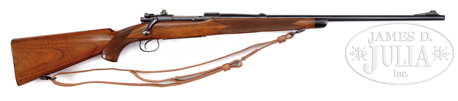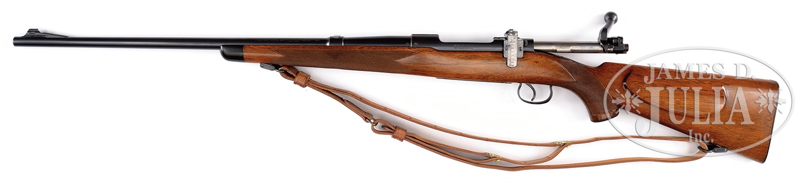 *WINCHESTER MODEL 54 SUPERGRADE BOLT ACTION RIFLE.SN 44776A. Cal. 30-06. Differing from the standard rifle primarily in stock design, the Supergrade was introduced in 1934. 24″ bbl with stippled ramp front sight, filler in rear dovetail and Lyman receiver sight. Floorplate is marked “Supergrade”. low comb cheekpiece Sporter stock with black forearm tip, hard rubber grip cap, checkered steel buttplate and military style sling on Supergrade swivels. Hand checkering wraps around wrist and bottom of forearm with open diamond around bbl screw. CONDITION: Orig blue shows spots of light fading and edge wear. Refinished stock shows a few small marks. Very good bore. 50707-7 DS (2,500-5,000) – Lot 1195