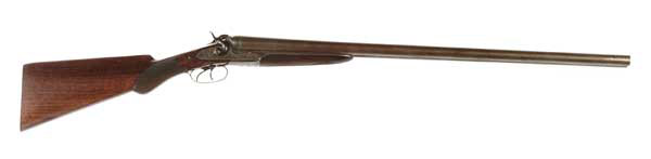 AMERICAN ARMS SIDE SWINGING DOUBLE BARREL SHOTGUN. Cal. 10ga. Unusual American made hammer shotgun with 29″ damascus bbls, makers name on the top rib. Built on CH Fox patent with long extended water table and short side locks. It has a small checkered splinter forearm with checkered Price of Wales rounded pistol grip stock with smooth steel buttplate. SN 122. CONDITION: Good. Retains 30-40% thin brown damascus pattern on the bbls. Traces of case color on the receiver and lockplates with the balance a silver-gray patina. Wood is sound with the forearm being dark and oil stained and the buttstock retaining most of a fine restored finish. Strong bores with scattered pitting. Left bbl appears to have been honed about half way and the muzzle end left dirty. 4-45970 JR429 (200-400)