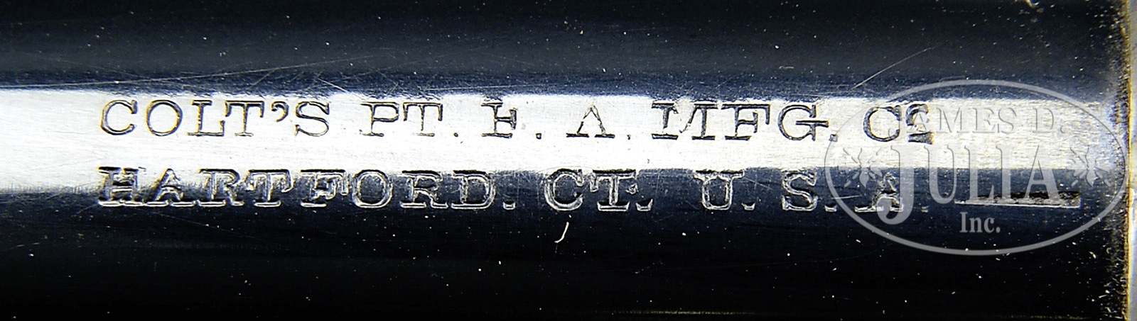 SCARCE COLT SHERIFF’S MODEL SINGLE ACTION ARMY REVOLVER.SN 154042. Cal. 32 WCF (32-20). Blue & color case hardened with 4″ bbl, full front sight and 2-line address with caliber marking on left side. Left side of frame has 2-line 3-patent dates and Rampant Colt in a circle. Mounted with Rampant Colt hard rubber grips that have last four digits of matching serial number inside each grip. Right grip has turned chocolate. Accompanied by a Colt factory letter which states that they were unable to locate any information in the factory records about this revolver “however, serial numbers 154040 to 154054 were shipped as Sheriff’s Models with the exception of 154042 and 154045”. According to Colt Peacemaker Encyclopedia, Cochran, he estimates that there were about 1,000 Sheriff’s Model Single Action revolvers produced over the entire production run. Mr. Cochran states that he had examined 167 Sheriff’s Model revolvers and extrapolating the numbers based on the assumed total production of 1,000, shows that 3.25% or 32 of the production were in caliber 32-20 and that 49.35% or 494 revolvers had 4″ bbls. He also estimates that about 60% or 600 revolvers had standard black powder frames and that 70.73% or 707 revolvers were blue & color case hardened finish. Regardless, this is an extraordinarily rare revolver in this high condition. PROVENANCE: Tommy Rholes Estate Collection. CONDITION: Extremely fine plus. Bbl retains about 98% glossy orig blue with only muzzle edge wear and some very faint scratches on the right side; frame & hammer retain about 95-96% orig case colors, brilliant in sheltered areas, lightly faded on top strap and loading gate, moderately faded on outer radius of left recoil shield; cyl retains about 90% strong orig blue with a series of fine scratches, probably from being cocked in the holster; cyl also shows sharp edge wear and a light drag line; trigger guard and backstrap retain about 85% orig blue, strong & bright on the trigger plate, top of the backstrap & buttstrap; front & back strap show light flaking & wear; grips are sound, showing little or no wear. Mechanics are crisp; brilliant shiny bore. 4-50672 JR339 (50,000-100,000) – Lot 1196