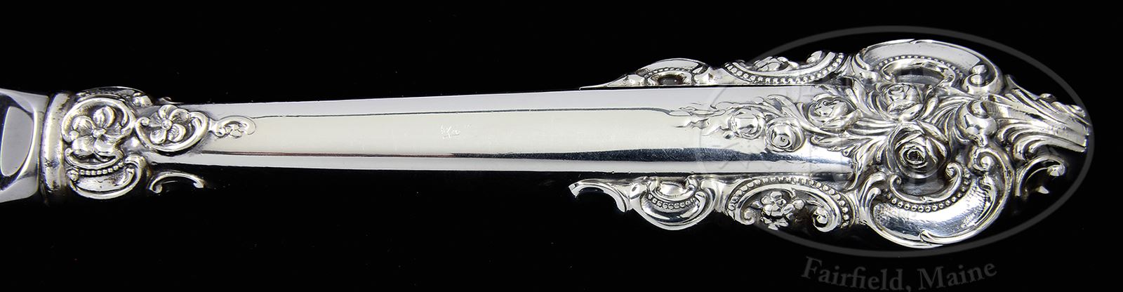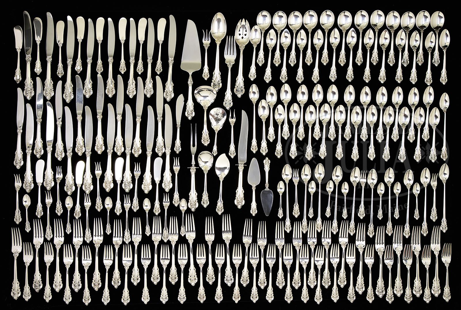 WALLACE GRANDE BAROQUE STERLING FLATWARE.Wallace Grande Baroque Sterling silver 183 piece flatware set includes: twelve dinner knives, twelve luncheon knives, twelve dinner forks, twelve luncheon forks, twenty-four salad/pastry forks, twenty-four teaspoons/desert spoons, twelve butter spreaders, twelve soup spoons, twelve iced tea spoons, twelve citrus spoons, twelve demitasse spoons, twelve seafood forks, along with fifteen various serving pieces. Each piece is marked “Wallace Sterling”. SIZE: Weight is approx 204 troy oz. CONDITION: Very good to excellent. 50497-14 (6,000-8,000) – Lot 1196