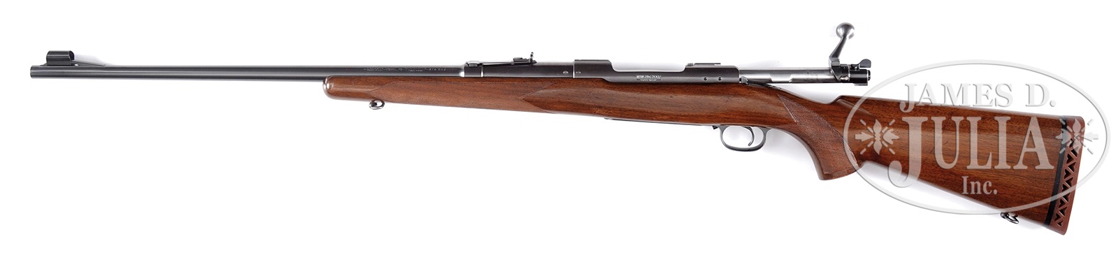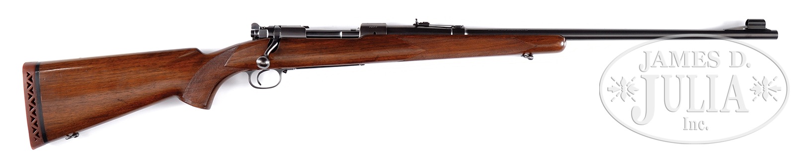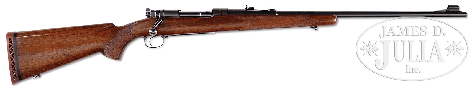 *SUPER RARE STANDARD WEIGHT BBL WINCHESTER PRE-WAR MODEL 70 BOLT ACTION RIFLE IN 375 H&H.SN 3269. Cal. 375 H&H Mag. Early rifle fitted with 24″ standard weight bbl. Bottom of bbl marked “32”, “375” and “MNS.” The Rifleman’s Rifle by Rule states that it is believed only 10 rifles in this caliber were made with 24″ standard weight bbls. Front sight is a Lyman 31W on smooth ramp with hood. Rear sight is style 22G. Action has H&H length receiver with cloverleaf tang and pre-war safety. Bolt body is numbered to rifle. Straight comb walnut stock with 22 lpi hand checkering and sling swivels. LOP 13-3/4″ over Hawkins ventilated red recoil pad. PROVENANCE: The Jon Roark Collection. CONDITION: Bbl and action retain nearly all of its rust blue refinish. Stock finish shows scattered scratches and handling marks. Very good bore. 50387-5 DS (9,000-14,000) – Lot 1196