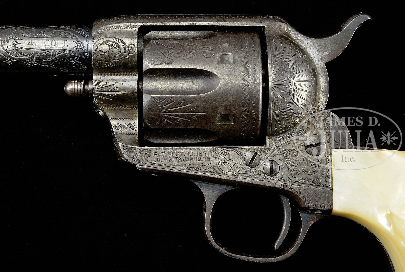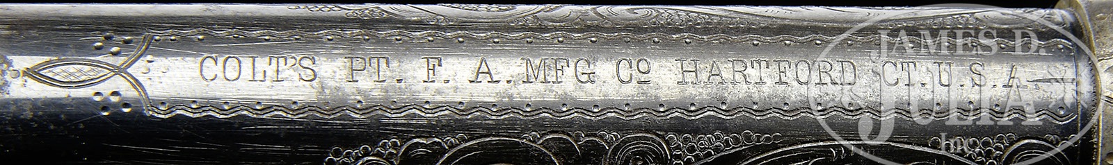 SN 149805. Cal. 41 Colt. Blue & color case hardened with 5″ bbl, full front sight and 1-line block letter address with caliber marking on the left side. Bottom of bbl is marked “41” under the base pin. Left side of frame has 2-line 3 patent date and Rampant Colt in a circle. Mounted with smooth 2-pc pearl grips that are probably not orig to this revolver. Revolver is deluxe engraved by Cuno Helfricht with about full coverage foliate arabesque patterns on the frame and his trademark flower blossom patterns on the recoil shield & loading gate. Top strap has snake & dot patterns with other typical Helfricht patterns in the front gullets of frame. Engraving patterns extend up both sides of the bbl with snake & dot border around the address. Top of back strap is engraved with Mr. Helfricht’s fan pattern and geometric patterns down the back strap, on the butt strap & trigger guard. Cylinder is engraved in typical alternating Helfricht patterns on the lands between the flutes with snake & dot patterns around the rear edge. Base pin is a period of use replacement. Accompanied by a very unusual, late 1800s period black Moroccan leather, doe skin lined small holster that fits this revolver perfectly. Right outside of the holster is fitted with a spring clip riveted to the holster. Also accompanied by a letter dated June 21,1994 to Mr. David Jackson of Dallas, TX over the signature of Martha Ann Reading of Dallas, TX. She states that this revolver, identified by caliber, was used by Mr. Albert A. Kochan when he was a brand inspector at the Houston Stockyards and she speculates he was a city marshal at that time. She states he later lived in Richmond, TX where he died in the 1940s and is buried there. She states that the accompanying holster was his original utility holster which he wore inside the waistband of his pants. The last paragraph, in part states “Mr. Albert was my husbands grandfather and was very proud of that particular gun–“. Additionally accompanied by 2 Colt Factory letters, each advising Mr. Rholes that there was no record of this revolver. According Colt Peacemaker Encyclopedia, Cochran there were an estimated 1000 single action sheriffs model revolvers produced in the period 1882-1911. Of that number he estimates that 350 had standard black powder frames and only about 8 had barrels longer than 4 inches. PROVENANCE: Tommy Rholes Estate Collection. CONDITION: Fine. Bbl retains 70-75% orig blue turning plum on the right side with a few scattered spots of light pitting toward the muzzle. Frame & grip frame retain traces of orig finish in the most sheltered areas being mostly a plum/brown patina. Cylinder is matching patina. Grips are sound with great fire & color. Grip locator pin is a replacement. Hammer is not solid in safety notch, otherwise mechanics are fine. Bright shiny bore with scattered fine pitting. Holster shows heavy wear with some stitching losses around the edges. It appears that this holster was made for a 4″ bbl but it is extremely evident that this revolver has been used in this holster extensively. The toe is open showing heavy wear in the correct areas around the toe. 4-50691 JR68 (40,000-60,000) – Lot 1197
