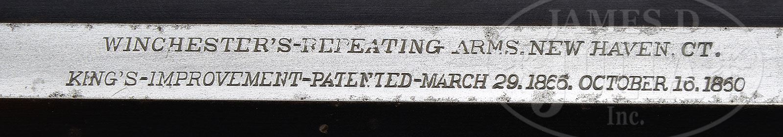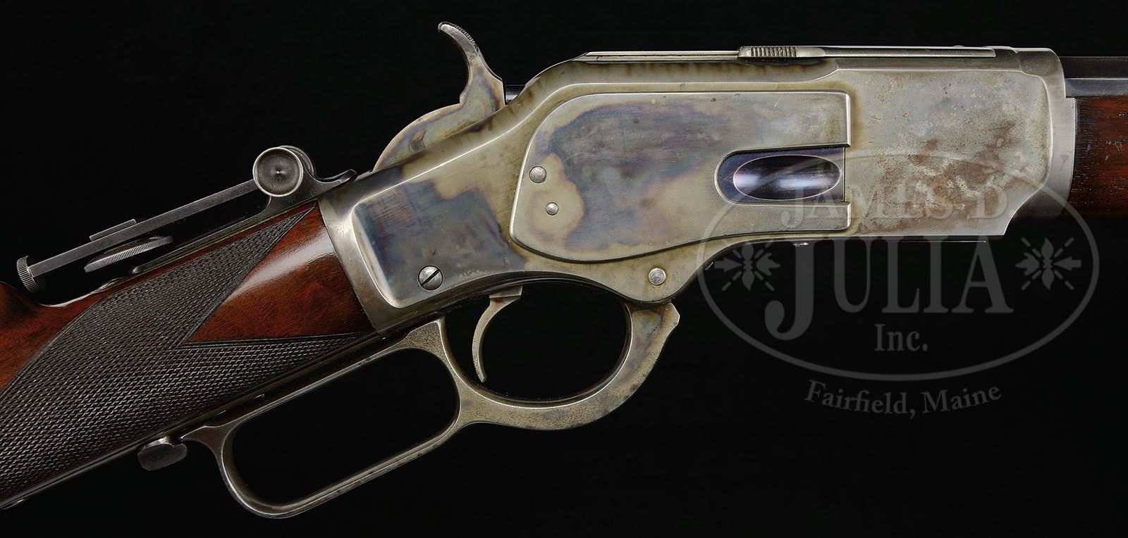 RARE EARLY WINCHESTER MODEL 1873 DELUXE 32 CALIBER LEVER ACTION RIFLE.SN 103476. Cal. 32 WCF (32-20). Rare deluxe rifle with 24-1/4″ oct to rnd bbl, full magazine, express front sight, special rear sight and vernier tang sight with 2-3/4″ staff. Receiver is third type with milled dust cover rail and is color case hardened. Receiver is small-bore type with stepped top front edge. Mounted with 1-2X second style checkered forearm and straight stock that has crescent buttplate with trap. Buttstock & forend cap have sling eyes. An additional special order feature is the nickel finished cartridge carrier in the receiver and sliding trap door in the buttplate. Left side of lower tang, under the wood, is marked with the assembly number “775”, “X”, “R” and “CF”. Left side of upper tang, under the wood is marked “32”. Accompanied by a Cody Firearms Museum research request yellow sheet which identifies this rifle with 1/2 oct bbl, plain trigger & checkered stock; received in warehouse Nov. 17, 1882 and shipped Nov. 20, 1882 to Order #1046. Also accompanied by a copy of the ledger sheet for this rifle. While the 1873 rifle in caliber 32 is not extremely rare, they are very rarely found with color case hardened receiver and in deluxe configuration with special order features. The buttplates on these rifles are almost never found with trapdoors. These small bore rifles were not considered “men’s” guns but were thought of as boy’s or lady’s rifles and usually saw very hard service with poor maintenance and are almost never found with high orig finish. CONDITION: Very fine plus, all matching. Bbl & magazine tube retain 95-97% strong orig blue with only light sharp edge wear; receiver & sideplates retain about 70-75% orig case colors, strong in sheltered areas, faded toward the front; hammer retains about 90% bright colors and the lever strong case colors on the sides, faded on outer faces; forend cap & buttplate retain most of their faded orig case colors. Wood is sound with a few light handling & storage nicks & scratches and retains most of its orig factory piano varnish. Mechanics are crisp, bright shiny bore with a couple of small spots of roughness. 4-47923 JR6 (30,000-50,000) – Lot 1198 Click here to view provenance