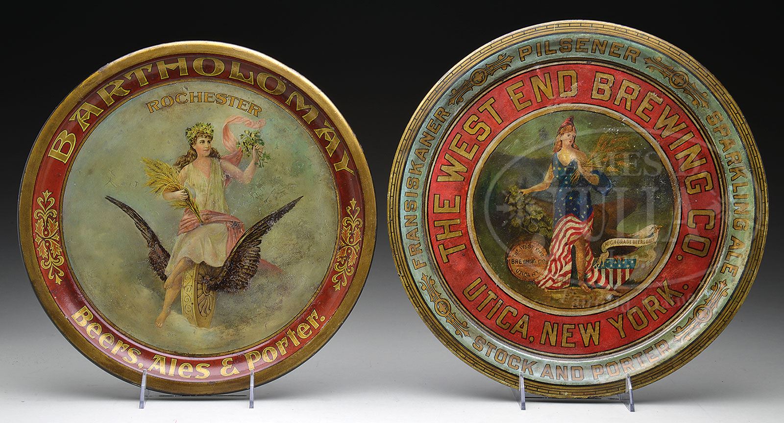 LOT OF 2 PRE-PRO BEER TRAYS.1) Bartholomay Brewing Company of Rochester, New York image of woman with sheaf of wheat and hops on a winged wheel. 2) The West End Brewing Company of Utica, New York tray with illustration of Miss Liberty, a heraldic shield and bald eagle. SIZE: 13″ dia. PROVENANCE: The Estate of Carol and Jerry Soling. CONDITION: 1) Fair; considerable wear to surface with heavy clear coat. 2) Poor to fair; significant wear; most of this tray has been repainted. 1-14685 (50-100) – Lot 1198 Auction: Advertising, Toy & Doll Auction - Fall 2014 Please Note: All prices include the hammer price plus the buyer’s premium, which is paid by the buyer as part of the purchase price. The prices noted here after the auction are considered unofficial and do not become official until after the 46th day. |