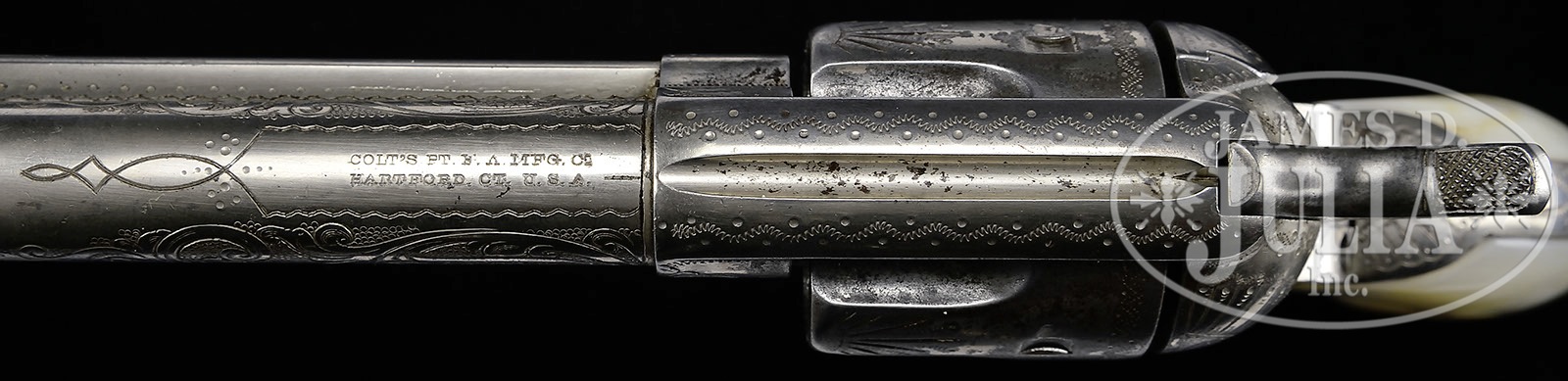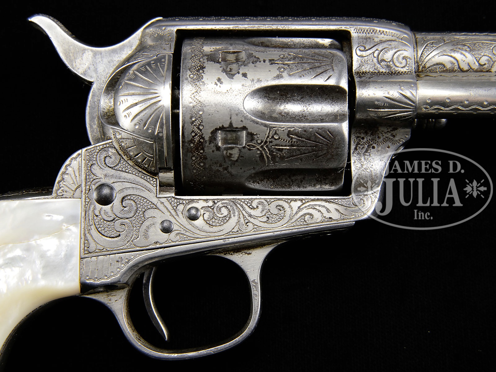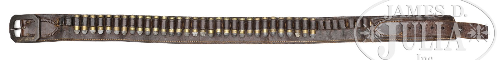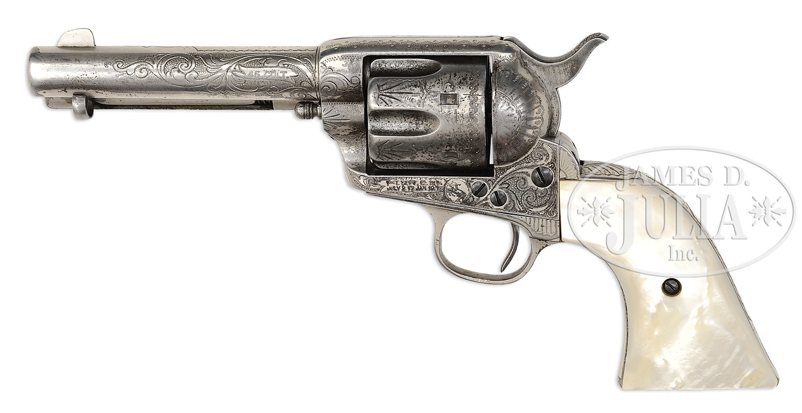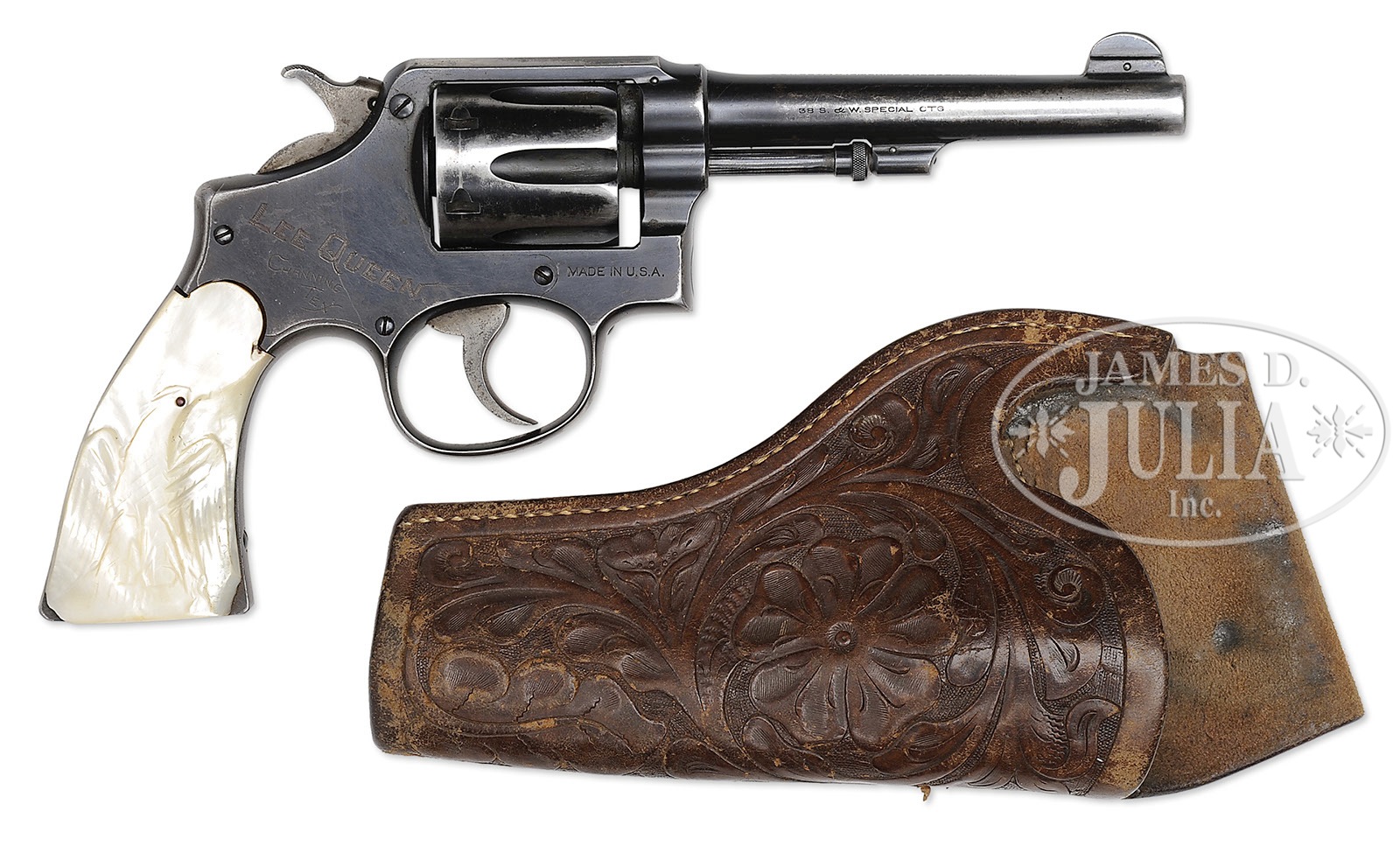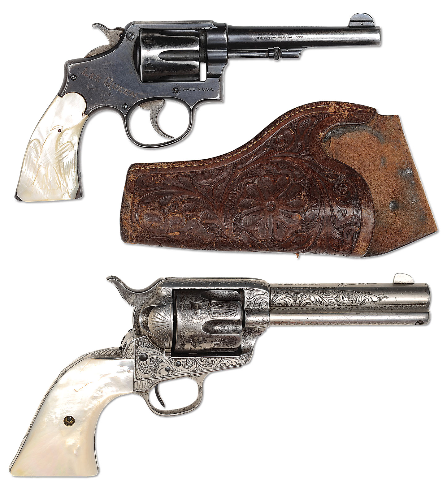 *LOT OF THREE FIREARMS, WATCHES, PHOTOGRAPHS & EPHEMERA THAT BELONGED TO TEXAS RANGER & COUNTY SHERIFF LEE QUEEN.1) Colt Single Action Army. SN 151191. Cal. 45 Colt. Nickel finish with 4-3/4″ bbl, slightly altered front sight and 2-line address with caliber marking on left side. Left side of frame has 2-line 3-patent dates and Rampant Colt in a circle. Mounted with smooth 2-pc pearl grips. Revolver is engraved by Cuno Helfricht with about “C” coverage foliate arabesque patterns on the frame and his fan patterns on recoil shield and loading gate. Top strap is engraved in snake & dot patterns and foliate arabesque patterns extend about 3/4 of the length on each side of the bbl. Ejector housing is engraved with snake & dot patterns in top gullet and outer radius. Cyl is typically engraved in Mr. Helfricht’s sunburst patterns on lands between flutes with snake & dot pattern around rear edge. Top of backstrap is engraved in a fan pattern with geometric patterns down the backstrap, on buttstrap & trigger guard. Accompanied by a Colt factory letter which identifies this revolver in caliber 45 Colt with 4-3/4″ bbl, nickel finish, pearl grips, factory engraved and shipped to J.F. Schmelzer & Sons, Kansas City, Kansas on Nov. 28, 1893 in a 2-gun shipment. 2) Smith & Wesson Hand Ejector DA Revolver. SN 585252. Cal. 38 Spcl. Blue finish with 5″ bbl and fixed sights. Mounted with 2-pc pearl grips that have deep relief carved eagle with red stone eye on right side. Right sideplate is jeweler engraved, through the blue, “LEE QUEEN. / CHANNING / TEX”. Accompanied by a tooled brown leather holster. 3) Winchester Model 1894 Saddle Ring Carbine. SN 585069. Cal. 30 WCF (30-30). Standard carbine with 20″ bbl, full magazine, square base front sight and 3-leaf carbine express rear sight. Receiver has a stud & ring. Mounted with uncheckered gum wood with straight stock & carbine buttplate. This lot is accompanied by a large volume of printed material relating to Ranger Queen. Robert Lee Queen was born Sept. 1869 in Williamson County, Texas and grew up near Round Rock. He moved to the Amarillo area as a child and in 1893 joined the Texas Rangers and served until 1897. After that he ranched and became a cattle inspector. In 1902 he was elected Sheriff of Hartley County and served a total of seven terms, nearly twenty years in two different sessions. He died in 1933. Among this large volume of material are several originals & copies of photographs of Ranger Queen and some of his company of Rangers. Included is a notarized statement from Tom O. Collins who states that he is the grandson of Lee Queen and that the firearms being sold here belonged to his grandfather which he used as a Ranger and Sheriff. Also included is a notarized letter from Atty. Rick McGarrey who states that the Colt Single Action being sold here belonged to his grandfather and was used during his term as a Ranger. Additionally included is an Elgin 18 size, silverode cased pocket watch that belonged to Lee Queen and a 14 kt. 3-color gold Hampton lady’s hunter case watch that belonged to his wife, Maggie Queen, that was sold to Mr. Rhodes by Virginia Queen Ayers, their daughter, signed receipt included. Additionally accompanying is the miniature badge of Ralph Queen, Lee Queen’s son, who succeeded him as Hartley County Sheriff and a campaign matchbook for Ralph Queen. Also accompanying is an unmarked cartridge/money belt, 36″ x 2-3/8″ with nickeled cut-corner steel buckle and forty 45 caliber cartridge loops, two of which are broken and contain thirty-one 45 caliber cartridges. And finally accompanied by a bronze statue of a western man wearing a cowboy hat & boots with gun belt & Bowie knife reloading his Colt revolver. It is titled “Lee Queen / COMPANY B TEXAS RANGER”. Artist signature is indecipherable but this statue is 1/10. PROVENANCE: Tommy Rholes Estate Collection. CONDITION: 1) Very good to fine. Overall retains 50-60% orig nickel showing heavy holster wear on left side of muzzle and tip of ejector housing with heavy wear on front of cylinder; loss areas are a gray metal patina; screws are fine and retain most of their orig fire blue, turned a little dark. Grips are fine and may be old replacements. Hammer is not solid in half cock notch, otherwise mechanics are fine, strong bore with moderate pitting. 2) Fair to good. Overall retains 50-60% dull orig blue showing heavy holster wear on bbl & cyl. Right grip has chipped heel & toe with chipped heel on left grip and another chip at the frame and show great fire & iridescent colors. Mechanics are fine, bright shiny bore. Holster is fine. 3) Good. Bbl & magazine tube retain about 85% orig blue; receiver retains traces of orig blue being mostly a worn gray metal patina. Forearm has 3 gouges and the stock a few more and overall retains a hand worn patina. Mechanics are fine, strong dark bore. Pocket watches appear to be running as of this writing. Badge is fine. Cartridge belt shows moderate to heavy wear with crackled finish and worn tongue billet. Ammunition is oxidized. Bronze is extremely fine. 4-50653, 4-50654, 4-50655 JR492 (25,000-40,000) – Lot 1199