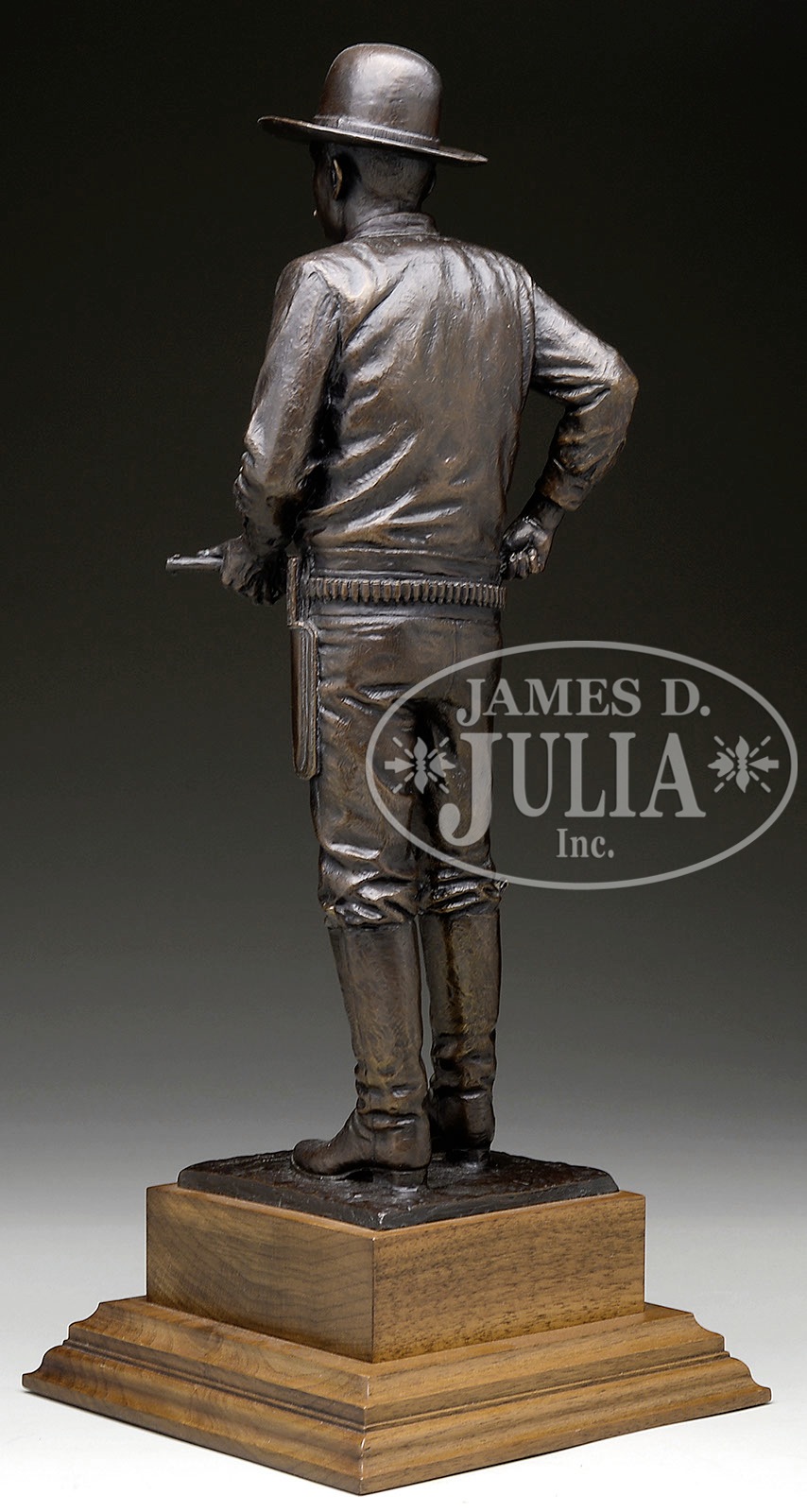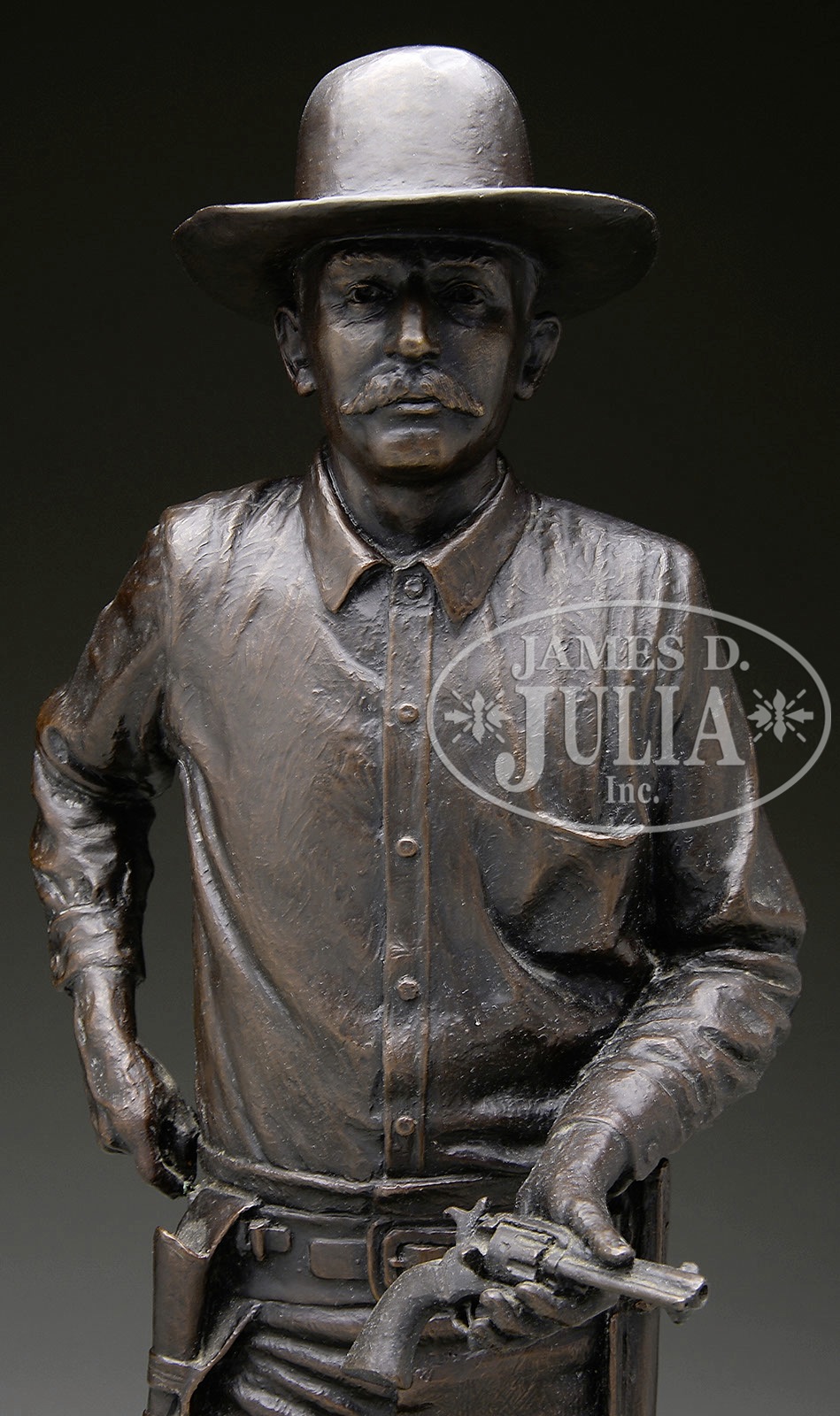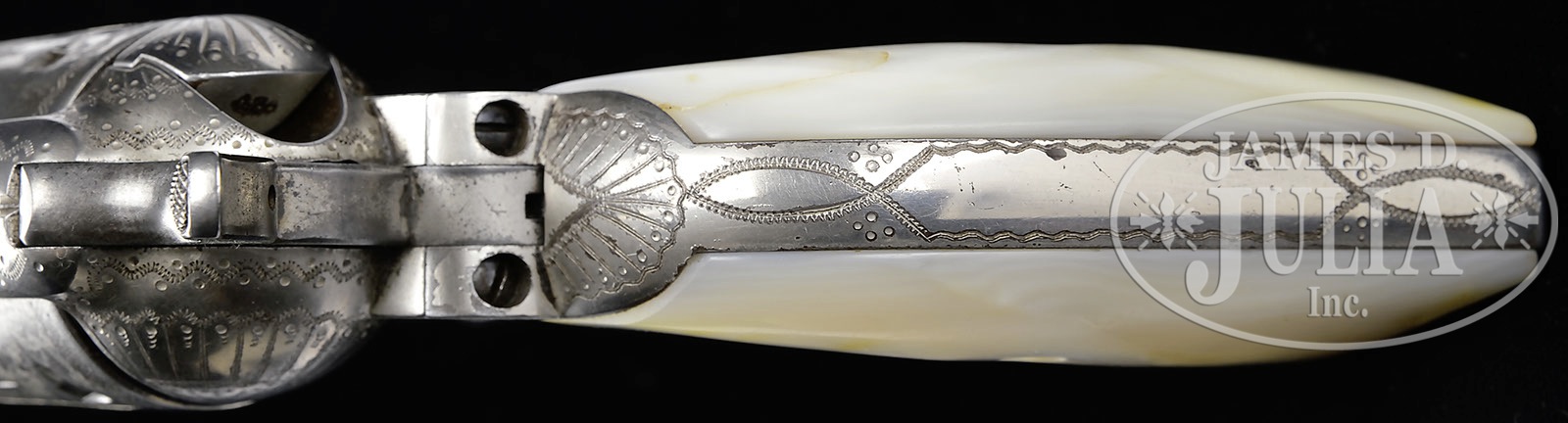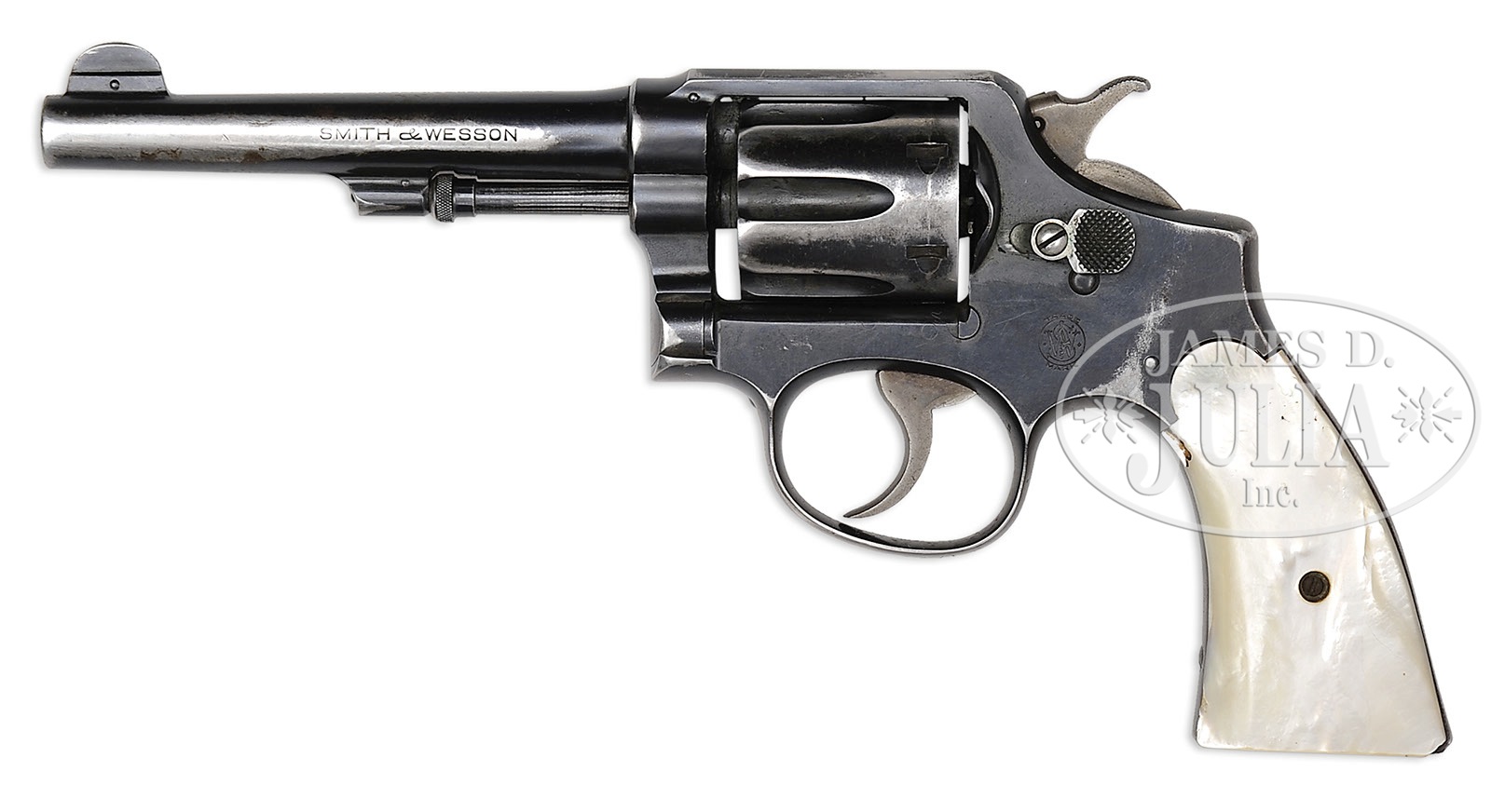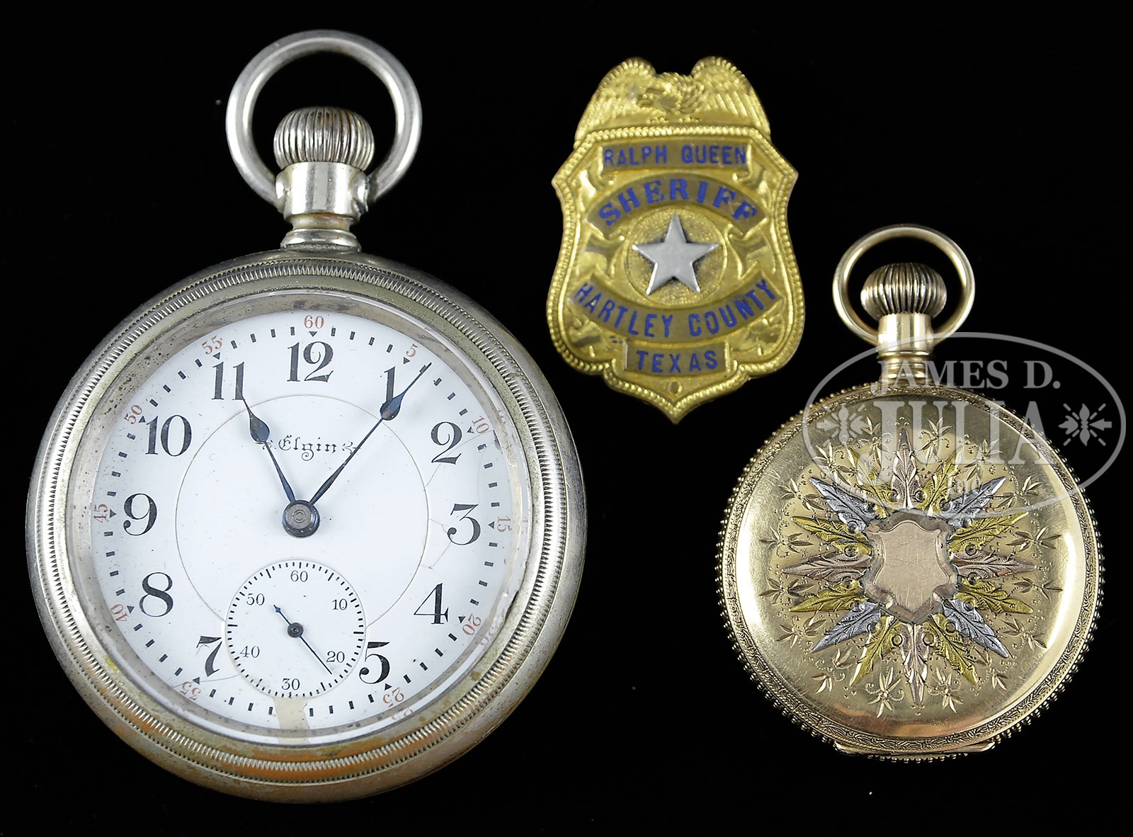*LOT OF THREE FIREARMS, WATCHES, PHOTOGRAPHS & EPHEMERA THAT BELONGED TO TEXAS RANGER & COUNTY SHERIFF LEE QUEEN.1) Colt Single Action Army. SN 151191. Cal. 45 Colt. Nickel finish with 4-3/4″ bbl, slightly altered front sight and 2-line address with caliber marking on left side. Left side of frame has 2-line 3-patent dates and Rampant Colt in a circle. Mounted with smooth 2-pc pearl grips. Revolver is engraved by Cuno Helfricht with about “C” coverage foliate arabesque patterns on the frame and his fan patterns on recoil shield and loading gate. Top strap is engraved in snake & dot patterns and foliate arabesque patterns extend about 3/4 of the length on each side of the bbl. Ejector housing is engraved with snake & dot patterns in top gullet and outer radius. Cyl is typically engraved in Mr. Helfricht’s sunburst patterns on lands between flutes with snake & dot pattern around rear edge. Top of backstrap is engraved in a fan pattern with geometric patterns down the backstrap, on buttstrap & trigger guard. Accompanied by a Colt factory letter which identifies this revolver in caliber 45 Colt with 4-3/4″ bbl, nickel finish, pearl grips, factory engraved and shipped to J.F. Schmelzer & Sons, Kansas City, Kansas on Nov. 28, 1893 in a 2-gun shipment. 2) Smith & Wesson Hand Ejector DA Revolver. SN 585252. Cal. 38 Spcl. Blue finish with 5″ bbl and fixed sights. Mounted with 2-pc pearl grips that have deep relief carved eagle with red stone eye on right side. Right sideplate is jeweler engraved, through the blue, “LEE QUEEN. / CHANNING / TEX”. Accompanied by a tooled brown leather holster. 3) Winchester Model 1894 Saddle Ring Carbine. SN 585069. Cal. 30 WCF (30-30). Standard carbine with 20″ bbl, full magazine, square base front sight and 3-leaf carbine express rear sight. Receiver has a stud & ring. Mounted with uncheckered gum wood with straight stock & carbine buttplate. This lot is accompanied by a large volume of printed material relating to Ranger Queen. Robert Lee Queen was born Sept. 1869 in Williamson County, Texas and grew up near Round Rock. He moved to the Amarillo area as a child and in 1893 joined the Texas Rangers and served until 1897. After that he ranched and became a cattle inspector. In 1902 he was elected Sheriff of Hartley County and served a total of seven terms, nearly twenty years in two different sessions. He died in 1933. Among this large volume of material are several originals & copies of photographs of Ranger Queen and some of his company of Rangers. Included is a notarized statement from Tom O. Collins who states that he is the grandson of Lee Queen and that the firearms being sold here belonged to his grandfather which he used as a Ranger and Sheriff. Also included is a notarized letter from Atty. Rick McGarrey who states that the Colt Single Action being sold here belonged to his grandfather and was used during his term as a Ranger. Additionally included is an Elgin 18 size, silverode cased pocket watch that belonged to Lee Queen and a 14 kt. 3-color gold Hampton lady’s hunter case watch that belonged to his wife, Maggie Queen, that was sold to Mr. Rhodes by Virginia Queen Ayers, their daughter, signed receipt included. Additionally accompanying is the miniature badge of Ralph Queen, Lee Queen’s son, who succeeded him as Hartley County Sheriff and a campaign matchbook for Ralph Queen. Also accompanying is an unmarked cartridge/money belt, 36″ x 2-3/8″ with nickeled cut-corner steel buckle and forty 45 caliber cartridge loops, two of which are broken and contain thirty-one 45 caliber cartridges. And finally accompanied by a bronze statue of a western man wearing a cowboy hat & boots with gun belt & Bowie knife reloading his Colt revolver. It is titled “Lee Queen / COMPANY B TEXAS RANGER”. Artist signature is indecipherable but this statue is 1/10. PROVENANCE: Tommy Rholes Estate Collection. CONDITION: 1) Very good to fine. Overall retains 50-60% orig nickel showing heavy holster wear on left side of muzzle and tip of ejector housing with heavy wear on front of cylinder; loss areas are a gray metal patina; screws are fine and retain most of their orig fire blue, turned a little dark. Grips are fine and may be old replacements. Hammer is not solid in half cock notch, otherwise mechanics are fine, strong bore with moderate pitting. 2) Fair to good. Overall retains 50-60% dull orig blue showing heavy holster wear on bbl & cyl. Right grip has chipped heel & toe with chipped heel on left grip and another chip at the frame and show great fire & iridescent colors. Mechanics are fine, bright shiny bore. Holster is fine. 3) Good. Bbl & magazine tube retain about 85% orig blue; receiver retains traces of orig blue being mostly a worn gray metal patina. Forearm has 3 gouges and the stock a few more and overall retains a hand worn patina. Mechanics are fine, strong dark bore. Pocket watches appear to be running as of this writing. Badge is fine. Cartridge belt shows moderate to heavy wear with crackled finish and worn tongue billet. Ammunition is oxidized. Bronze is extremely fine. 4-50653, 4-50654, 4-50655 JR492 (25,000-40,000) – Lot 1199