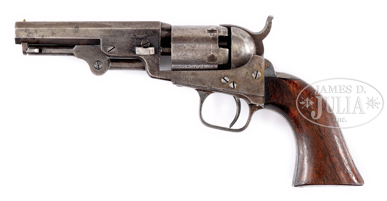 FINE COLT MODEL 1849 PERCUSSION REVOLVER.SN 186131. Cal. 31. 4″ Colt pocket made at the height of Civil War fervor in early 1861. Gun is 100% original, authentic and matching. It has good aesthetics and original finish. PROVENANCE: The Estate of G. W. “Bill” Stewart of Sonora, Texas. CONDITION: Bbl retains about 20% original blue with balance a mottled plum/gray. There are numerous small dents on the right side of the wedge slot on lug. Frame loading assembly and hammer retain traces of case color with balance smooth gray/plum. Trigger guard and backstrap retain about 30% of their silver plate with bubbling. Cylinder is a matching plum/gray with 80-90% cylinder scene visible. 49973-124 JS (1,000-2,000) – Lot 1199