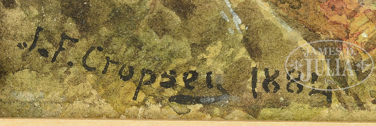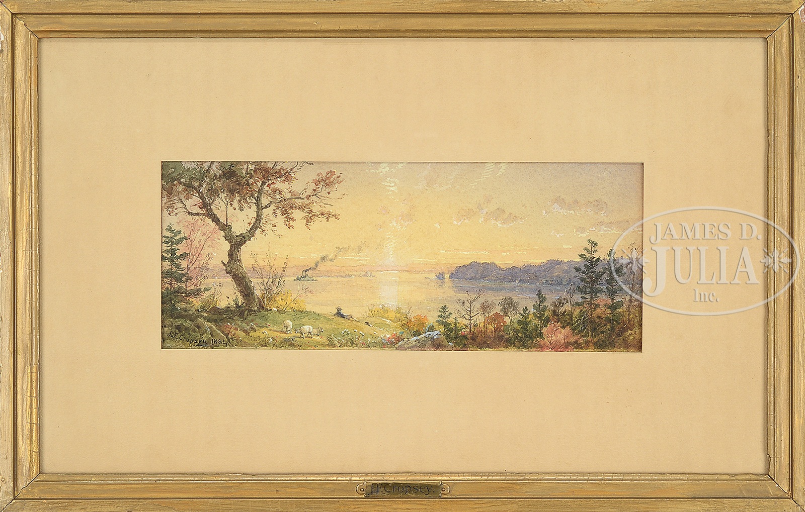 JASPER FRANCIS CROPSEY (American, 1823-1900) SUNRISE OVER THE ST. LAWRENCE RIVER.Watercolor on paper Housed in a gold painted wood frame with presentation plaque Signed and dated lower left “J.F. Cropsey 1884″ Note: Possibly a companion to a similar watercolor offered at Bonham’s, lot 28, November 30, 2010. SIZE: 5″ x 13”. Overall: 13-1/2″ x 21-1/2″ PROVENANCE: Acquired by Mr. & Mrs. Carl Stern of New York, from the Cropsey family; by descent to current owner CONDITION: Overall good. The work is slightly faded and paper is mounted to cardboard. 50608-1 (6,000-9,000) – Lot 1200