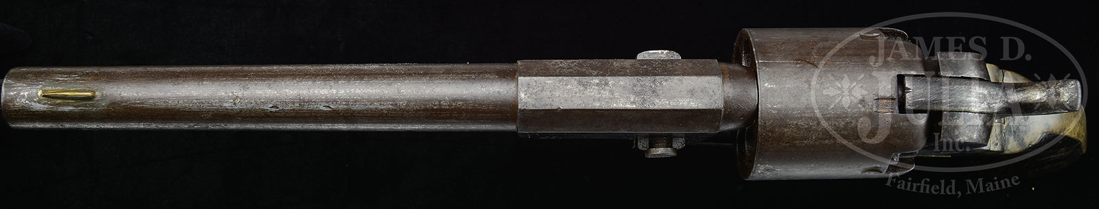 VERY FINE & RARE CONFEDERATE DANCE REVOLVER.SN 243. Cal. 44. James Henry Dance and his brothers, originally members of the 35th Texas Cavalry, somehow were allowed to have detached service making revolvers in Columbia, TX, later moving in December of 1863 to Anderson, TX when the operation was sold to the Confederate government. These Dance dragoons are copies of Colt Model 1848 dragoon pistols popular in Texas frontier prior to war. Of the approximate 100 Dance pistols that survive, about 85 are 44 Cal. SN 243 is found on all major parts including bbl, left side of loading arm, cylinder, frame, hammer, wedge, trigger guard and backstrap. Overall edges are sharp. Action is tight and functional. This gun by NRA standards grades good-very good. By Confederate standards this gun is quite fine with crisp edges, traces of finish and well defined bore. Dance revolvers saw hard Confederate use, mostly in the Western and Trans-Mississippi theaters of the war. Any Texas Confederate soldier would be proud to carry a Texas made revolver of the highest quality. Gun appears to be orig and authentic as used and is above average of most encountered specimens. All screws, cones, sights and internal parts appear orig, even though the wedge screw and latch appear as war time modifications. This is a beautiful gun that surfaced in an estate sale in Houston, TX in 2003, and at that time became the 82nd known Dance dragoon. Texan collectors have kept lists of Dance revolvers since the 1940’s and the survival and history of this manufacturer is better known than any other Confederate arms maker. PROVENANCE: Houston Texas Estate, 2003; Mike Clark, Houston, TX, 2003; Lifetime Collection of Dr. Zack Catterton, 2003. CONDITION: Gun is overall very good, complete and orig with only repair noted of the bbl latch which appears orig to revolver’s time of use along with contemporary wedge screw, both have matching patina and surface to rest of gun. Iron surfaces are overall mottled brown/grey with tiny traces of finish in protected areas with scattered staining and pitting. SNs are all crisp & well-defined. Cylinder retains 5 partial safety pins with crisp, well-defined perimeter line at front edge. Gun does appear “as found” with no restoration since the Civil War. There is a break in the trigger bow and there is a cracked break right ear of backstrap that do not affect aesthetics. Mechanically gun has good action and crisp rifling in bore. Grips are very good, well fit with considerable edge wear and some erosion on left side exhibiting good hand worn patina. Letters of authenticity accompany, one from noted Confederate revolver expert, Fred Edmunds. 51566-4 JS (40,000-60,000) – Lot 1200 Click here to view provenance