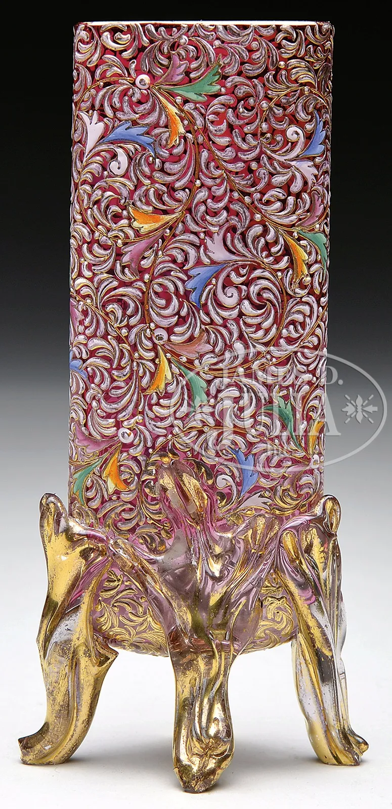MOSER CRANBERRY GLASS VASE.Moser cranberry glass vase is decorated with allover stylized enameled leaves and flowers with white swirling leaves and pink, blue, green, and yellow flowers. The vase is finished with four applied and gilded free form feet. Vase is pictured in the book Moser Glass: The Klabin Collection by Gary D. Baldwin, pg. 47, plate 55. SIZE: 7-1/2″ t. PROVENANCE: George Klabin Collection. CONDITION: Very good with some minor roughness to feet. 5-67424 (200-400) – Lot 1201