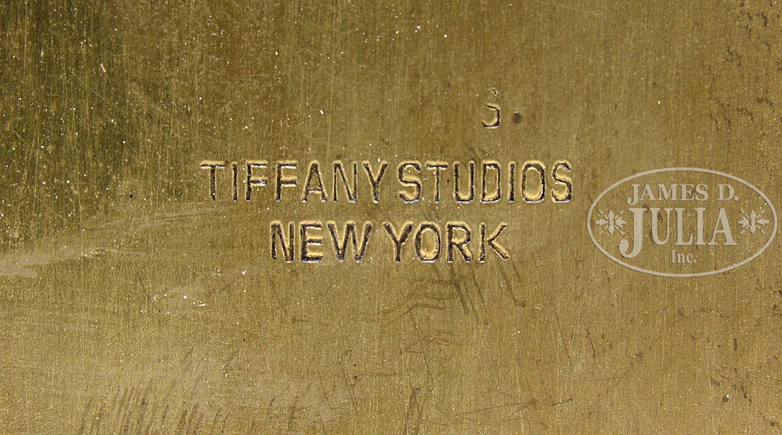 TIFFANY STUDIOS ABALONE PICTURE FRAME.Tiffany Studios picture frame in the abalone pattern has grape clusters with abalone shell inlays at all four corners. Frame is further decorated with flowing lines encircling the frame in art nouveau design. Frame is finished in bright gold patina with remnants of green polychrome in the design. Signed on the back “Tiffany Studios New York”. SIZE: 7-1/4″ w x 10-1/4″ t. Picture opening: 4″ x 5-1/2″. CONDITION: Very good with wear and discoloration to patina. 49778-47 (3,000-5,000) – Lot 1201
