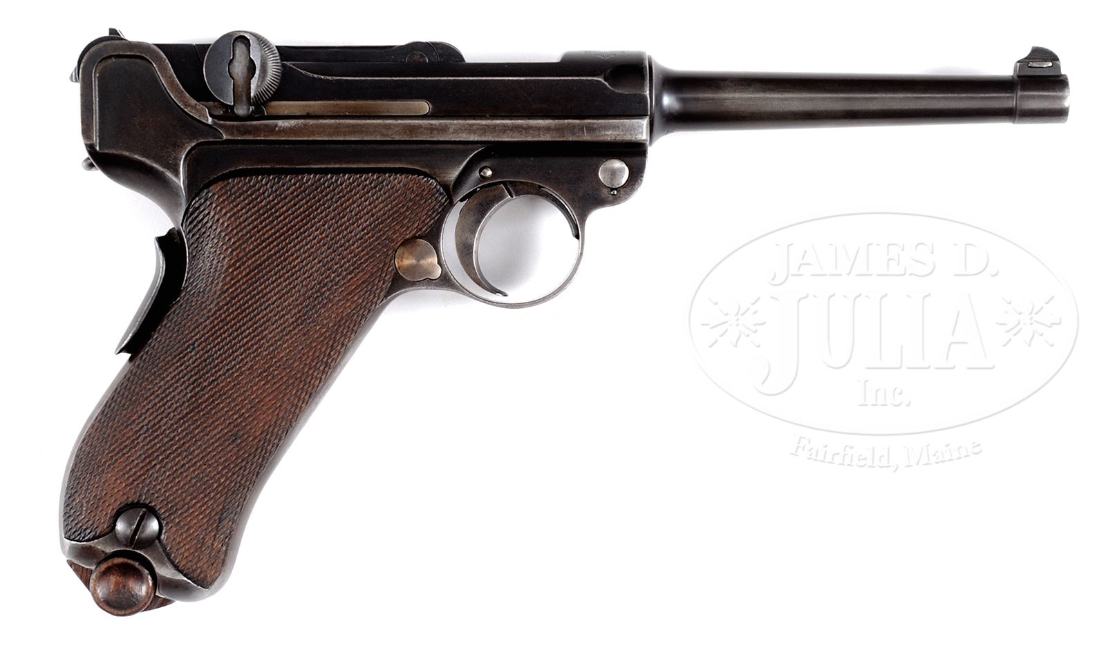 *LUGER, 1900 SWISS, LATE PRODUCTION.SN 21234. Cal. .30 Luger. Late production M1900 Swiss Luger, made by DWM with 4-3/4″ tapered bbl, having drift adjustable front sight. Fixed rear sight mounted on rear toggle link. Early flattop breech block with repaired extractor. Dished middle toggle ears with anti-bounce spring. Late serrated safety. Chamber marked with Swiss cross within starburst. Full SN under bbl and forward frame. Crown/B, crown/U, crown/G markings under bbl with repeated crown/B and crown/U on left receiver. Disassembly shows all matching numbers except for the grip safety that is marked “269”. Neither of the wood checkered grips is numbered, though the right panel is lightly imprinted with a star. Later magazine with tinned body and unmarked wood base. CONDITION: Approx 20% orig blue, largely confined to the top of the receiver, toggle train and other protected areas. Balance has drifted to a brownish mottled patina with cold blue application. Most of the straw has faded from small parts, cleaning and restrawing having been applied to trigger, takedown lever, safety and magazine release. Grips oil darkened but with excellent checkering. Near excellent magazine with crisp wood base having no discs. Bright bore with strong rifling and mild oxidation, better than one would expect from the condition of the pistol. Perfect manual mechanics. 49547-3 LMA C&R (1,250-2,250) – Lot 1203