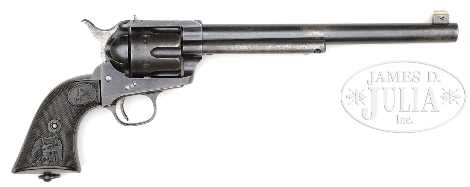 EXTRAORDINARILY RARE COLT FRONTIER SIX SHOOTER FLAT TOP TARGET SINGLE ACTION ARMY REVOLVER WITH 9″ BARREL.SN 130266. Cal. 44 WCF (44-40). All blue finish with the one and only 9″ barrel ever found on a target model Single Action. It has German silver target front sight and 1-line block letter address with “COLT FRONTIER SIX SHOOTER” roll marked on the left side. Bottom of the bbl, under ejector housing is marked with a tiny “44”. Frame is flat top style with target rear sight in the top strap and three patent dates on the left front side. Left front web of trigger guard is marked “44 CAL”. Buttstrap has a factory lanyard swivel & ring. Mounted with Rampant Colt / Eagle hard rubber grips. Top of bbl and face of cyl are marked with small British proofs. The location of these proofs is most unusual, as they are usually found on the side of the bbl & cyl in the flutes. Accompanied by a Colt factory letter which lists this revolver in Cal. 44-40 with 9″ bbl, blue finish and rubber grips, shipped to Schoverling, Daley & Gales, NY, NY on Sept. 17, 1889 in a 1-gun shipment. Also accompanied by a 2-page letter from renown Colt researcher, historian and author, R.L. Wilson, wherein he verifies most of the information above plus stating that this revolver is the only one listed in the Colt records with a 9″ bbl. Mr. Wilson also states that one of the more well known owners of this revolver was the John B. Solley, III collection. Additionally accompanied by a letter from Arnold Marcus Chernoff to someone who apparently purchased this revolver from him. He states that this is the only known flat top Single Action target model with factory 9″ bbl. He also states that this revolver was originally in the Solley Collection and was traded to R.L. Wilson in about 1982. Mr. Chernoff states that he purchased it from Mr. Wilson. This revolver is pictured in a group shot on p. 193 of The Colt Heritage, Wilson. And finally, accompanied by an orig black leatherette covered, green felt lined casing that has nickelled hardware in front and a carrying handle. Inside the bottom is compartmented for the revolver and has a wire handle cleaning brush. Right center has a cartridge block containing 42 “WRACO” headstamped cartridges with small copper primers. The style of case is contemporary to the revolver and may have been supplied by Colt. According to Colt Peacemaker Encyclopedia, Cochran, only 917 Single Action revolvers were produced, out of which only 21 were in Cal. 44-40 and this is the only one with 9″ bbl. Mr. Cochran states that only 11 revolvers had a bbl length other than 7-1/2″, all of which he lists on p.176 showing this serial number in Cal. 44-40 with 9″ bbl and Eagle grips. PROVENANCE: Tommy Rholes Estate Collection. CONDITION: Very good to fine. Bbl retains strong blue in the most sheltered areas being mostly a plummy/blue patina with a cleaned area about mid-point and showing wear on the left side; frame has a couple of screwdriver oops scratches on the left side and overall retains 60-70% thinning orig blue, stronger in sheltered areas; cyl is a plummy patina as are the trigger guard, front & back straps; grips are sound and show moderate wear, turning slightly chocolate on the left side. Hammer is not solid in safety notch, otherwise mechanics are fine; bright shiny bore with scattered fine pitting. Case is very fine showing light corner wear and overall retains about all of its orig finish. Interior is heavily faded but sound with intact partitions. Ammunition is fine. 4-50755 JR332 (30,000-50,000) – Lot 1205