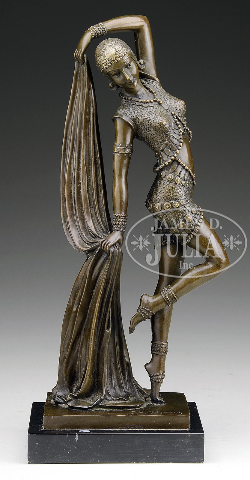 AFTER DEMETRE CHIPARUS (Romanian, 1886-1947) THE DANCER.Bronze Signed on base “D H Chiparus” Mounted to a slate base SIZE: 17″ h CONDITION: Very good 50023-7 (2,000-3,000) – Lot 1205