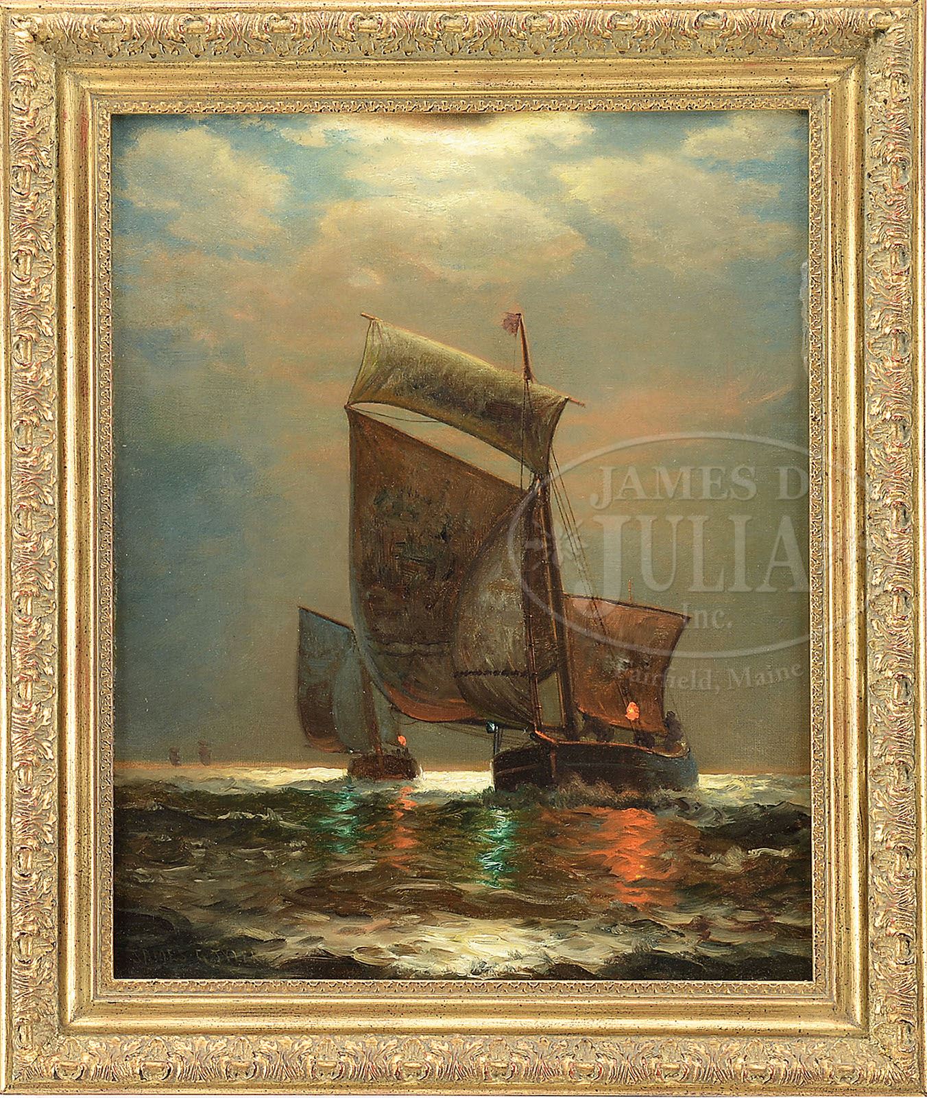 JAMES GAYLE TYLER (American, 1855-1931) SLOOPS-NIGHT RUNNING. Oil on canvas Housed in a decorative gilt gesso decorated frame Signed lower left SIZE: 20-1/4″ x 16-1/4″. Overall: 24-1/2″ x 20-3/4″ PROVENANCE: Ex Private collection, the Robert C. Held Trust San Francisco. CONDITION: Relined, inpainting, otherwise very good 9-90892 (800-1,200)
