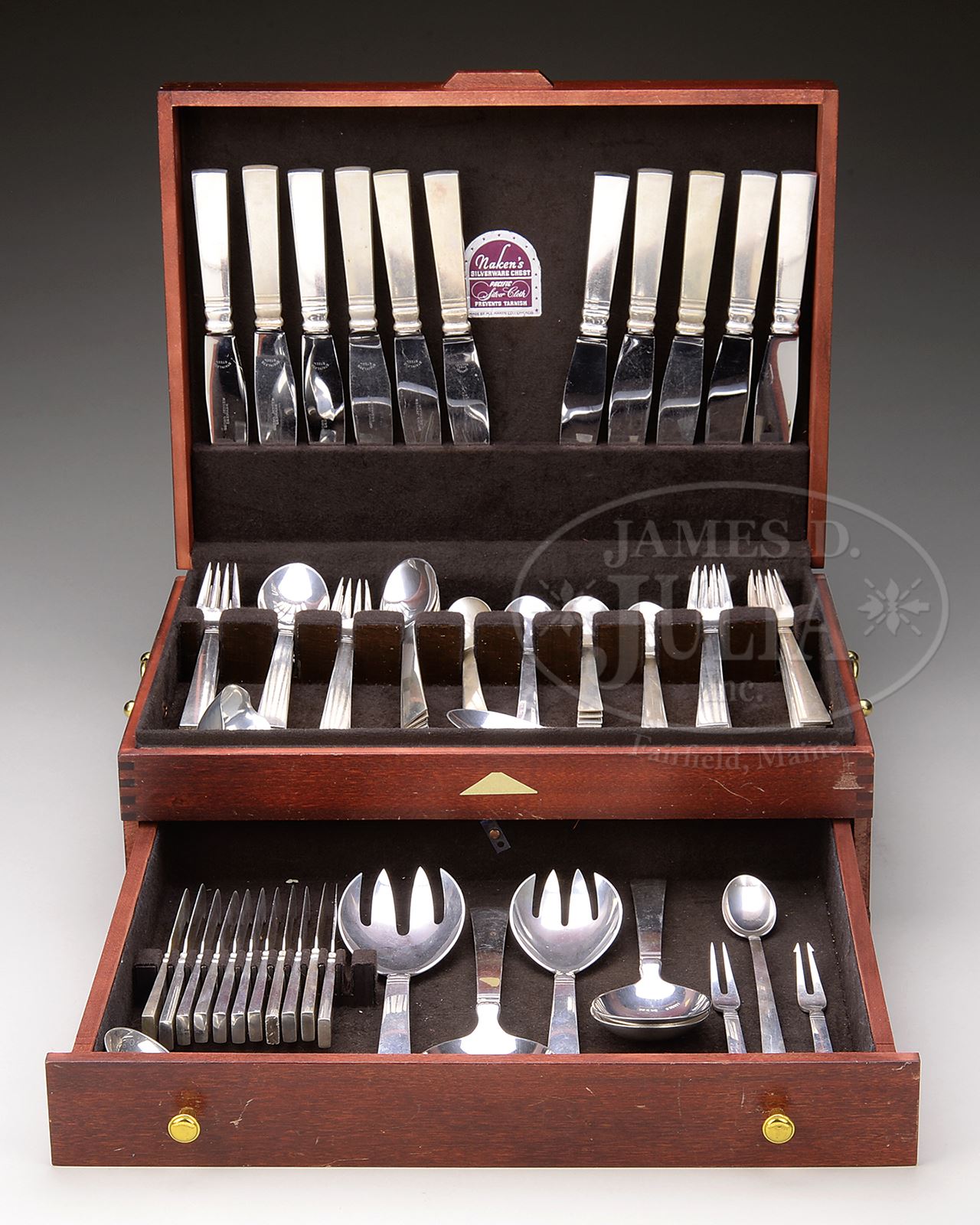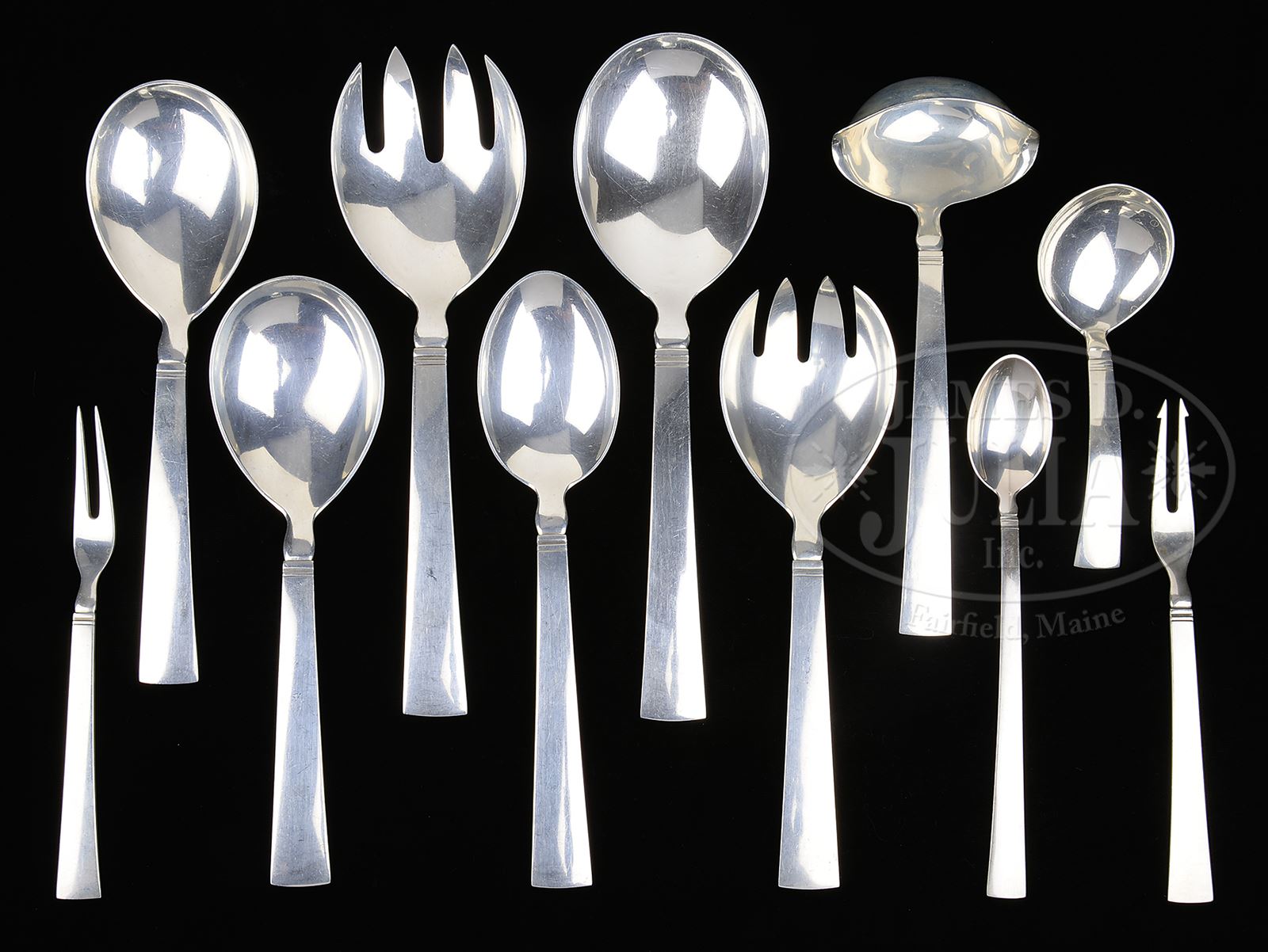 GEORG JENSEN STERLING SILVER FLATWARE SET.Georg Jensen sterling silver flatware set in Acadia Block pattern has simple straight lines with double band near bottom of handle. Set consists of eleven dinner knives, twelve dinner forks, eleven salad forks, twelve tablespoons, twelve teaspoons, eleven butter spreaders, one large ladle, one small ladle, two serving spoons, two sets of salad spoons and forks, two pickle forks and one iced tea spoon. Each piece is signed on backside “Georg Jensen Sterling Denmark”. With wooden case. SIZE: Weight is approx 102 troy oz. Not including dinner knives. CONDITION: Very good to excellent with some minor surface wear. 50361-71 (1,500-2,500) – Lot 1207