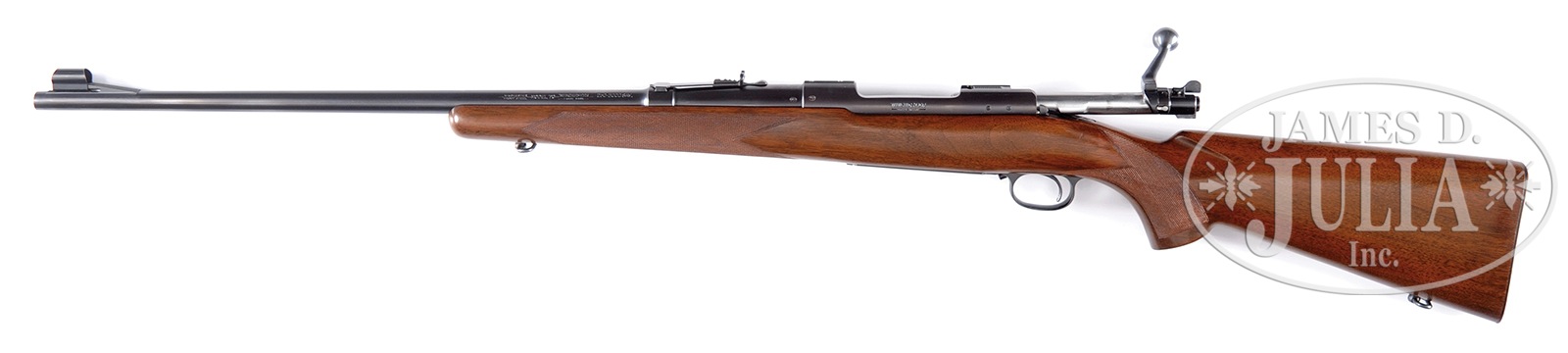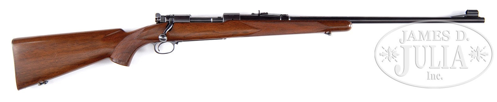*WINCHESTER PRE-WAR MODEL 70 BOLT ACTION RIFLE.SN 3111. Cal. 250-3000 Savage. Standard grade rifle with pre-war features including safety and cloverleaf tang. Bolt body numbered to rifle. 24″ bbl with stippled ramp hooded front sight and No. 22H rear sight. Bottom on bbl has date code of 36. Straight comb walnut stock featuring 22 lpi hand checkering with checkered steel buttplate and sling swivels. PROVENANCE: The Jon Roark Collection. CONDITION: Bbl and rec retain 98% orig rust blue. Both handle and bottom metal show slight fading. Very good stock finish showing light and scattered handling marks. Very good bore. 50387-4 DS (3,000-4,500) – Lot 1207