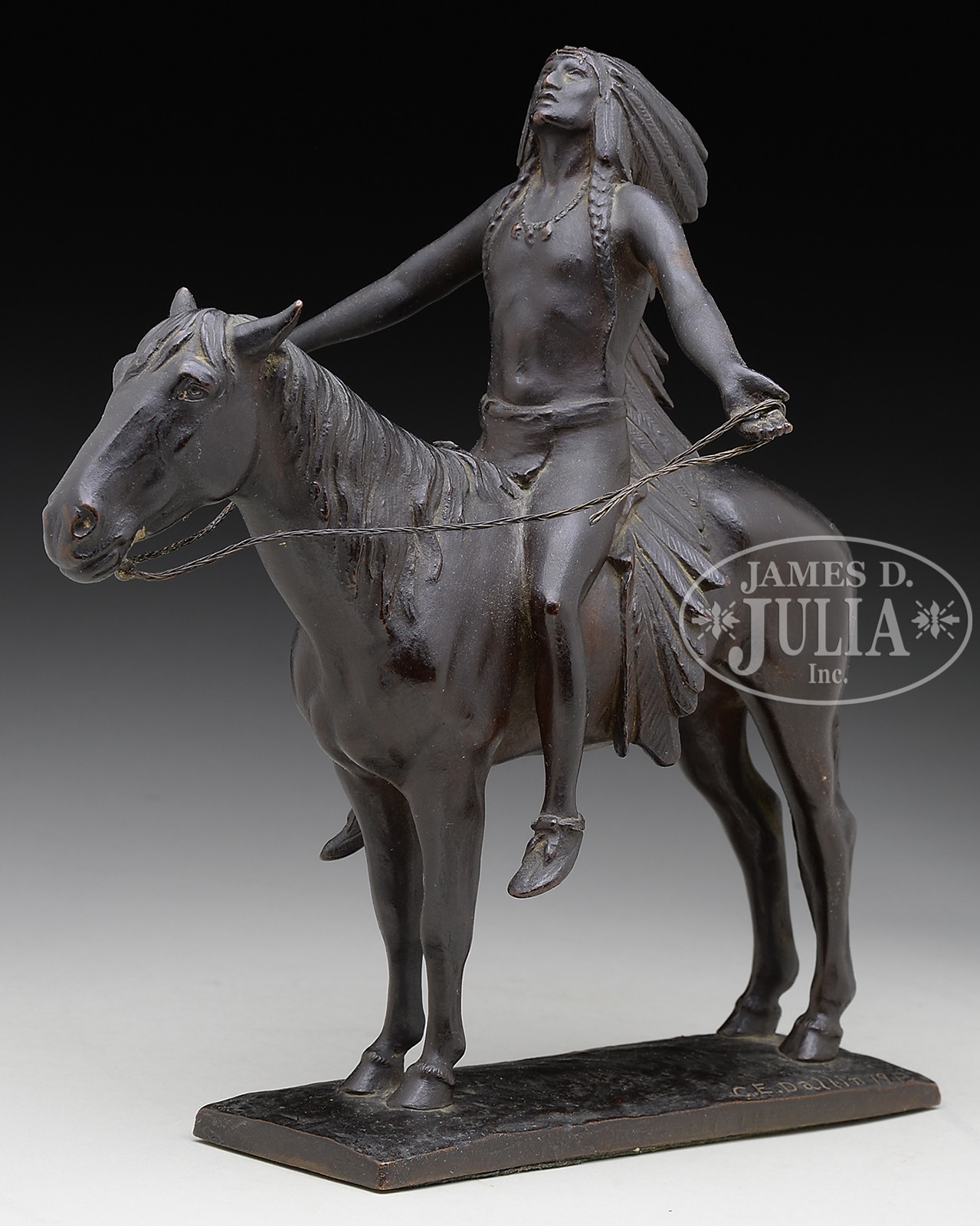 CYRUS EDWIN DALLIN (American, 1861-1944) “APPEAL TO THE GREAT SPIRIT”.Bronze Base inscribed “C.E. Dallin 1913”. Marked on the back of the base “Gorham Co. Founders OXC” Unknown casting date SIZE: 9″ h PROVENANCE: From a Maine/Texas estate being sold unreserved CONDITION: Light wear to surface 51398-17 (1,000-2,000) – Lot 1207