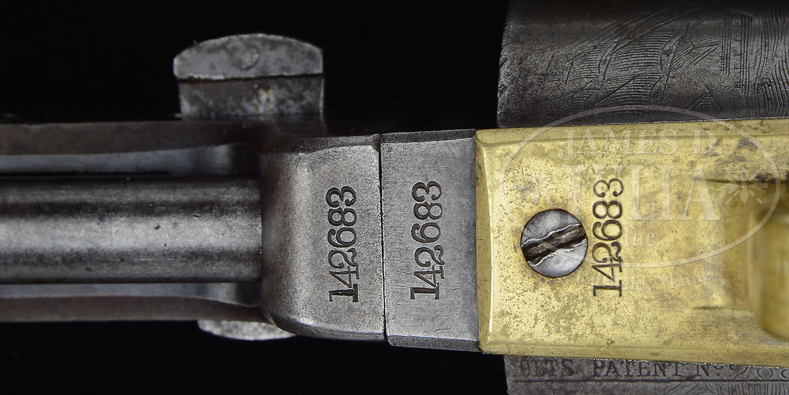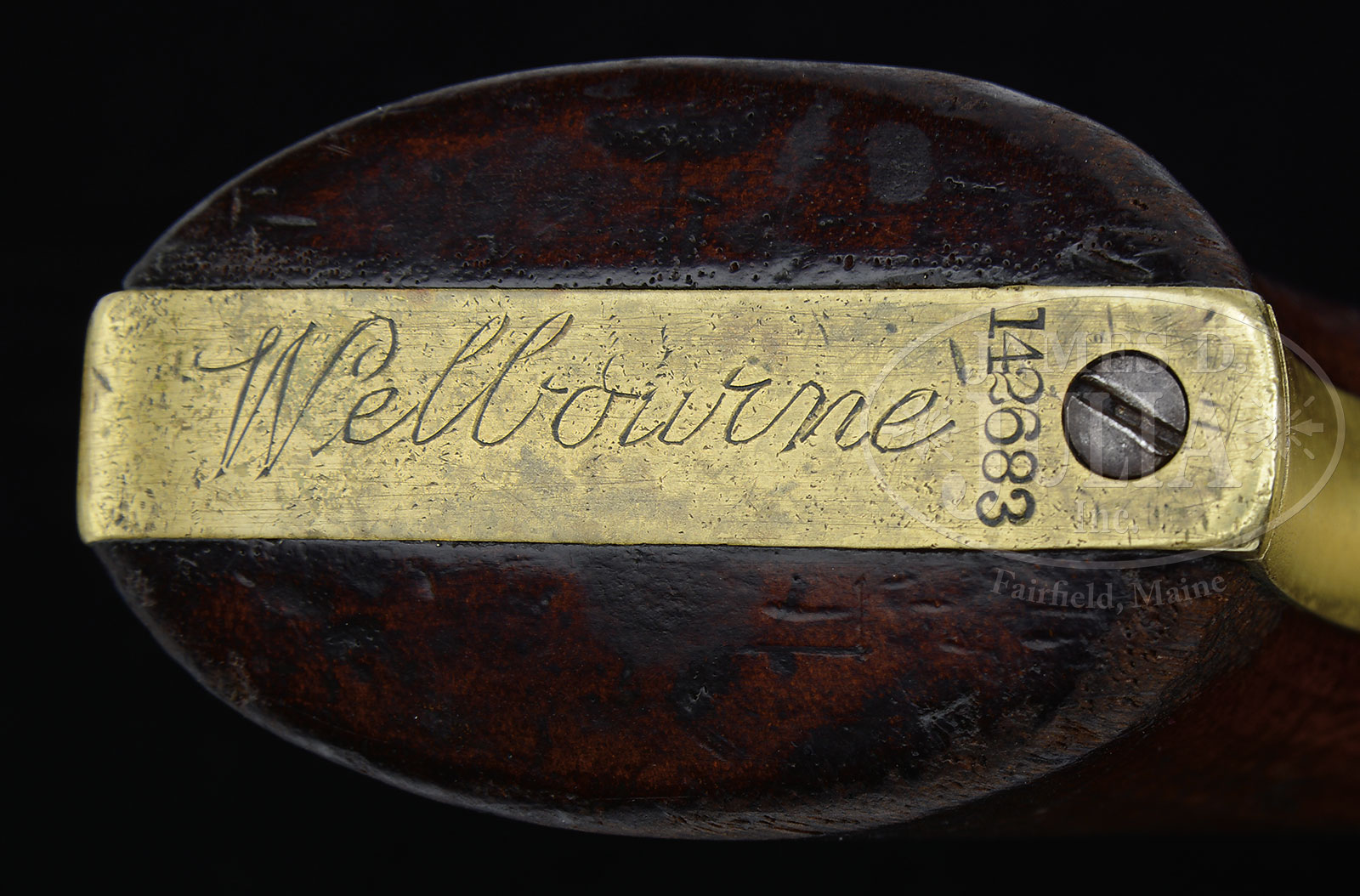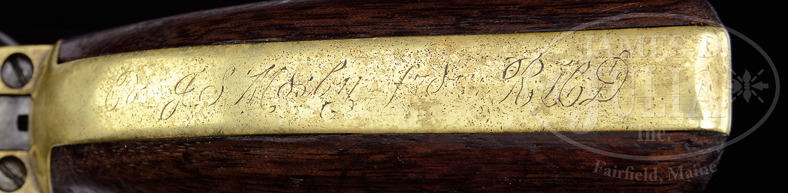 CONFEDERATE COL. JOHN S. MOSBY PRESENTATION COLT MODEL 1851 NAVY PERCUSSION REVOLVER.SN 142683. Cal. 36. This gun originally was in the extensive John S. Mosby Collection of the late Bob Daly of Middleburg, Virginia who had large collection of personal Mosby objects, including many orig letters and documents direct from the Mosby descendants.. Usual configuration with 7-1/2″ oct bbl, brass cone front sight and 1-line New-York U.S. America address, “COLTS PATENT” on left side of frame and Cal. marking on left shoulder of trigger guard, brass trigger guard and back strap with 1-pc walnut grip. Backstrap is engraved in period script “To J.S. Mosby from R.H.D.” and buttstrap is inscribed in matching script “Welbourne”. John Singleton Mosby was born in Virginia in 1833, educated locally and in 1849 entered the Univ. of Virginia. In 1852 he was expelled for shooting another student, a bully, who had insulted him. He was convicted of the crime and was sentenced to one year in jail and a $500 fine. He was pardoned by the Governor and the fine rescinded. At the outbreak of the Civil War he joined the Confederate Army as a private even though he was opposed to secession. He later stated that he fought for Virginia, not for slavery. In his early career he rode with the Washington Mounted Rifles but was recognized for his intelligence gathering abilities and in early 1862 was promoted to 1st Lieutenant and was authorized to form & command the 43rd Battallion, 1st Virginia Cavalry, Partisan Rangers. He was promoted to Captain and then Major in March 1863, to Lt. Col. in January 1864 and Colonel in December 1864. His command was notorious for their lightning-like and stealthy raids on Union supply trains and encampments. He was known by one & all as the “Grey Ghost”. At the end of the war he did not surrender his command but simply disbanded them. After the war he became a staunch Republican and worked on Gen. Grant’s campaign for president and subsequently was appointed Consul to Hong Kong 1878-1885. He served in numerous other government & state positions throughout the remainder of his career and died in 1916. The initials in the presentation on back strap of this revolver, “RHD”, are thought to be for Richard Henry Dulany (1820-1906), also a Virginian and cavalryman for the Confederacy. The Dulanys are a very old and venerated Virginia family and members of the wealthy Virginia aristocracy having arrived from Ireland in 1703. The Dulany ancestral home is called “Welbourne” and remains in the Dulany Family today as a public Bed & Breakfast Inn. In July 1861, Richard H. Dulany personally equipped a company of mounted riflemen, the Dulany Troop. Col. Mosby and Dulany were apparently friends during the war with recorded instances of Mosby and his troops resting and recuperating at Welbourne. Richard Dulany was originally a Captain in the 7th Virginia Cavalry in command of the Dulany Troop then was appointed Lt. Col. in October 1862 and Colonel in October 1864. He was wounded on three separate occasions and survived numerous campaigns and battles including Jackson’s Valley Campaign, Cedar Mountain, Second Manassas, Antietam, Wilderness Campaign, Spotsylvania, Cold Harbor & several others. Accompanied by a packet of information regarding Col. Dulany including copies of his military record and copies of several photographs of Col. Mosby both in and out of uniform and with his family. Also included is the book The Dulanys of Welbourne, A Family in Mosby’s Confederacy, Vogtsberger, which consists primarily of letters between Col. Dulany and his family. Col. John Mosby was one of the most famous and enigmatic characters of the Civil War. Due to his unpredictability and daring & dashing raids against the Union troops his capture and/or death was greatly pursued by the Union. This cataloguer recalls reading somewhere that there was, unusually for a military person, a substantial reward offered for his capture or proof of his death. Apparently his continuing raids and the inability of the Union to capture him was greatly demoralizing to the Union Army in that area. Mosby supposedly preferred the 1851 Navy to all other hand guns as did so many other Confederate officers. If this gun could only speak and tell us how Dulany obtained this pistol made at the height of the Civil War in early 1863 and gave it to his comrade. Dunlay’s wartime letters should be read. PROVENANCE: Ex-Collection Bob Daly, Middleburg, VA. CONDITION: Very good, all matching except wedge which is numbered “20364” and the rammer handle which is numbered “2688”. (Grip was not checked.) Bbl & frame retain a gray/brown patina with traces of blue in most sheltered areas of bbl. Rammer handle is also a gray patina with traces of case colors in sheltered areas. Grip frame is an even light mustard patina, having been cleaned and polished in the past, now beginning to regain a patina. Grip is sound showing heavy edge wear with nicks, dings and scratches and retains about 50-60% orig varnish. Cylinder is a matching patina to the frame and retains about 60% Ormsby Naval battle scene. Mechanics are fine, strong dark bore 51619-1 JS (15,000-25,000) – Lot 1209 Click here to view provenance