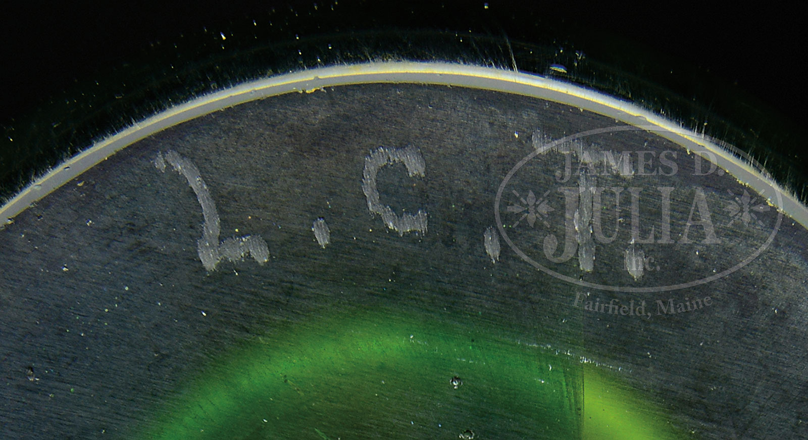 Tiffany Studios vase has bronze holder with vertically ribbed trim surrounding the round platform foot while four legs support a center bronze cylinder that houses the favrile glass vase. The bronze is finished in a gold statuary patina. The favrile insert has a green pulled feather design rising from the bottom against a rich gold iridescent background. The bronze holder is signed on the underside “Tiffany Studios New York 715”. The vase is signed on the underside “L.C.T.”. SIZE: 25″ t. PROVENANCE: From the Unreserved Estate of Lynda Cunningham. CONDITION: Bronze foot is very good to excellent. Glass insert is very good with some minor staining to the interior. 51361-96 (1,500-2,500) – Lot 1209