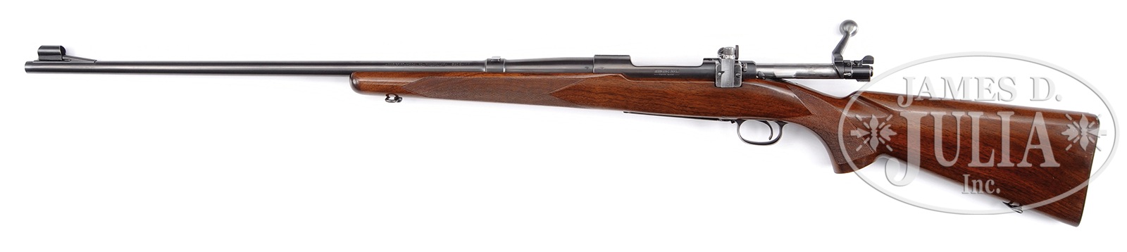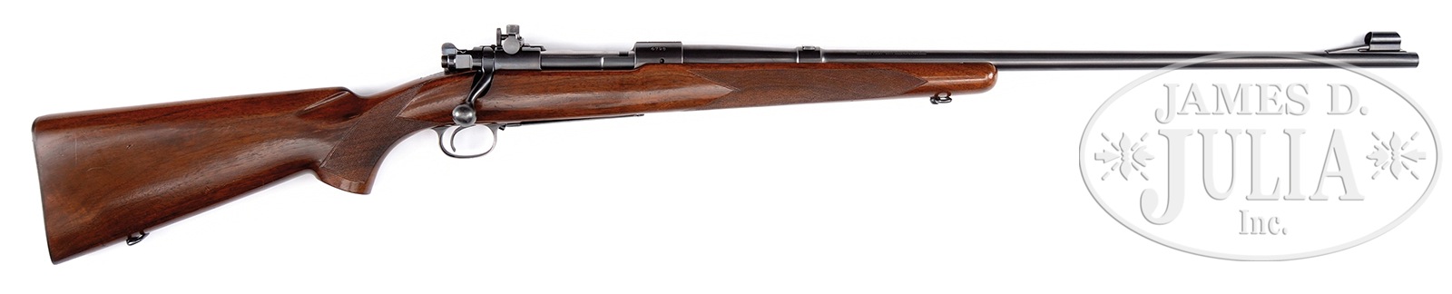 *VERY FINE PRE-WAR WINCHESTER MODEL 70 CALIBER 220 SWIFT.SN 4796. Cal. 220 Swift. Manufactured in 1937 with 26″ bbl with blue finish overall with Lyman receiver sight, early wing type safety on matching bolt. Traditional checkered Winchester stock with proper metal checkered buttplate. CONDITION: Exceptional overall with most all blue finish remaining on receiver. Stock has had a slight additional coat of finish applied and is very difficult to discern from factory. Trigger guard has slight finish loss from period flaking. Bore and mechanics are excellent. Receiver ring has the proper two holes for scope mount and bridge of receiver has none. A very fine example of a pre-war Model 70. 50989-13 TDW (1,500-2,500) C&R – Lot 1210