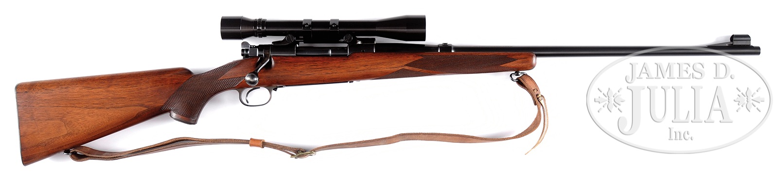 *CUSTOMIZED WINCHESTER MODEL 70 BOLT ACTION RIFLE.SN 835. Cal. 257 Roberts. Action has pre-war safety and cloverleaf tang. 24″ bbl with hooded ramp front sight and Williams filler in rear dovetail. Bausch & Lomb Balfor-A external adjustment scope with fine dot reticle. Custom straight comb classic style Sporter stock of black walnut. Stock features ebony tip insert, ebony diamond around forend screw and utilizes Winchester hard river grip cap and checkered steel buttplate. Checkering is borderless with point pattern style. Unmarked leather sling on Winchester style sling swivels. Weight 8 lb 15 oz. CONDITION: Very good blue with blotchy of flaking on floorplate. Buttplate finish has faded to gray. Stock has satin finish showing a few small marks. Very good bore. 50707-8 DS (2,500-5,000) – Lot 1211