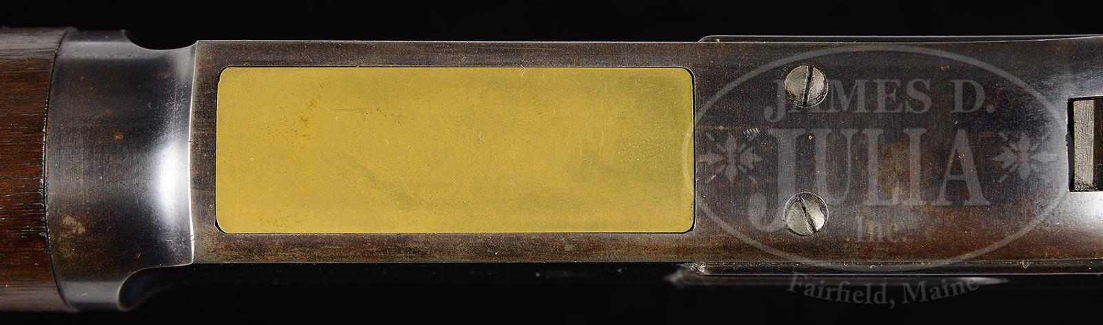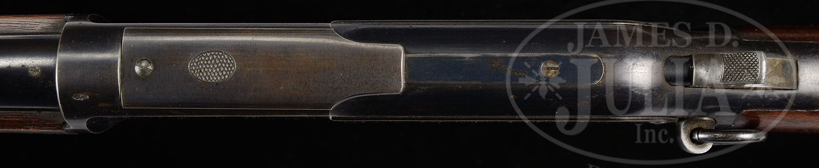 WINCHESTER MODEL 1876 SADDLE RING CARBINE WITH INSCRIBED SIDEPLATE.SN 1852. Cal. 45-75. Standard grade Saddle Ring Carbine with 22″ rnd bbl. Barleycorn front sight and Model 1866 style 2-position flip rear sight graduated “1”, “3” and “5”. Receiver is 2nd Model with attached dust cover rail and 2nd type dust cover with impressed thumb print. Left side of receiver has a stud & ring. Left sideplate is engraved “JNO. RIGBY & CO. / 72 ST. JAMES’S ST. / LONDON”. Lever has the bottom & rear faces of loop covered in brown leather. Mounted with uncheckered straight grain American walnut which includes a full length forearm and straight stock that has carbine buttplate without trap. Left side of lower tang, under the wood, is marked with two assembly numbers “339” and “386”. Both numbers are also found in top tang channel of buttstock. Buttplate is numbered “386” inside the toe. Bbl & receiver have British proofs. Very likely this carbine would have belonged to an English gentleman for hunting in Africa or India. Those rifles usually saw hard service and are often found with very little orig finish. CONDITION: Extremely fine, all matching. Bbl retains about 98% orig blue with the forend cap showing about 96% orig blue and the middle band about 95%; receiver retains about 90% orig blue, a little dulled on bottom & top edges with a few scattered chemical spots on left front flat; lever & hammer retain strong case colors, faded on outer faces; buttplate retains about 70-75% strong case colors, moderately faded. Mechanics are crisp, brilliant shiny bore. 4-55546 JR337 (17,500-27,500) – Lot 1213