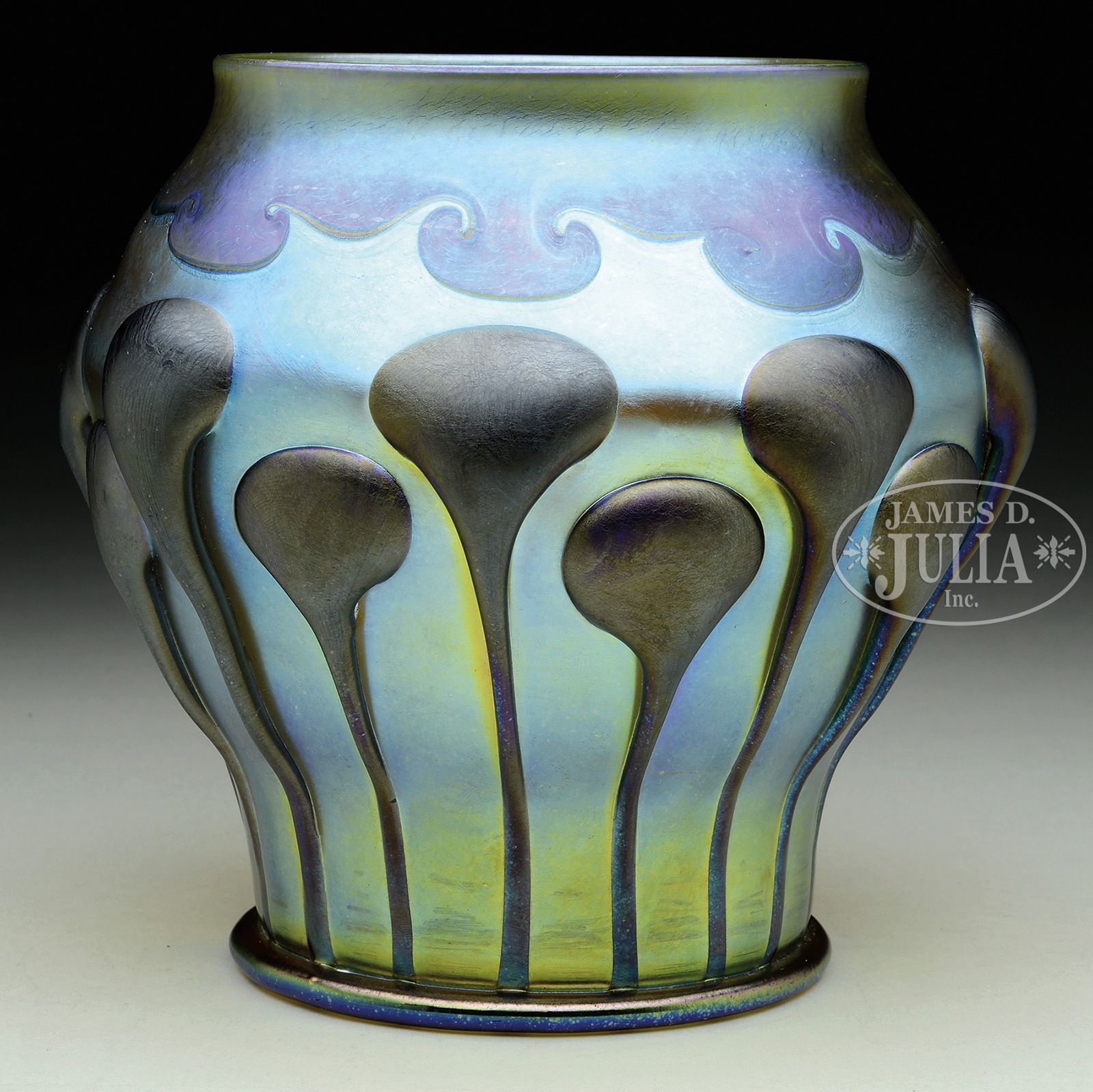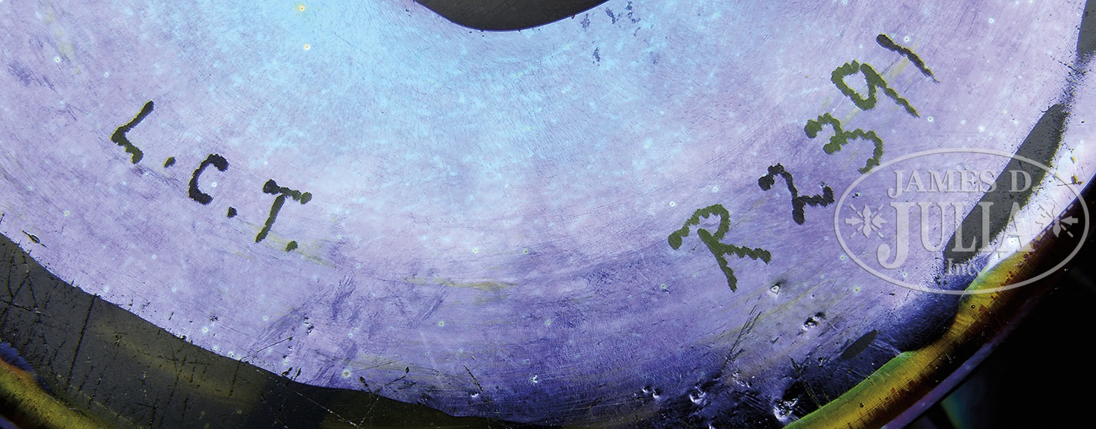 TIFFANY FAVRILE DECORATED VASE.Tiffany favrile vase has platinum iridescent body with blue and gold highlights. Vase is further decorated with a hooked feather design descending from the lip and is encircled by 2 rows of applied purple glass tendrils with gray iridescent finish. Signed on the underside “L.C.T. R2391”. SIZE: 6″ t. CONDITION: Very good to excellent. 49694-1 (10,000-15,000) – Lot 1213