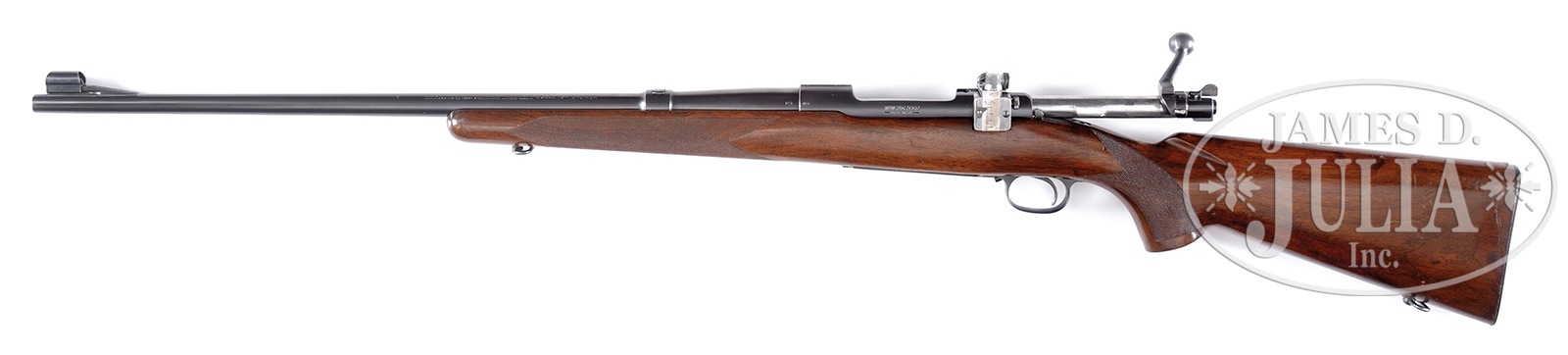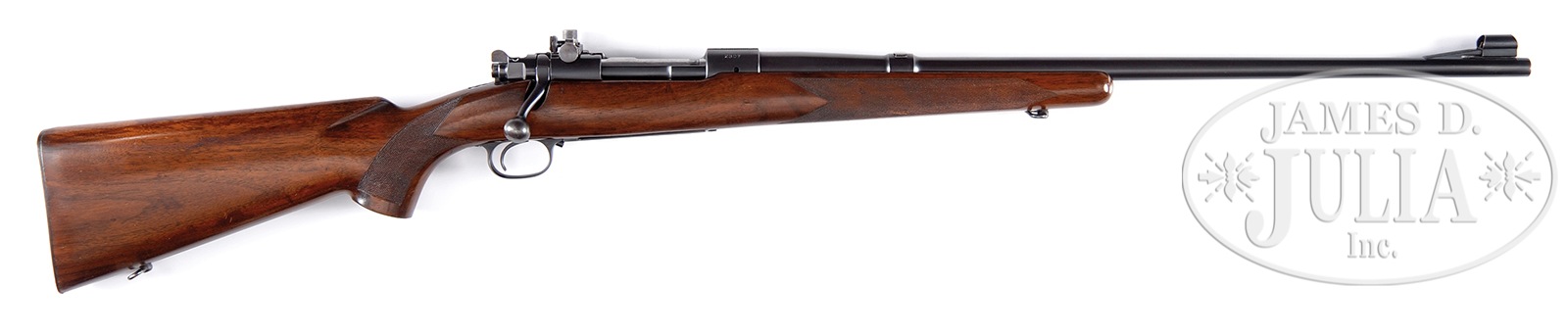 SN 2307. Cal. 270 WCF. Very early rifle with pre-war safety and cloverleaf tang. Rear receiver bridge has clip loading slots and matted surface without sight attachment holes. Bolt is numbered to rifle. 24″ bbl with stippled ramp hooded front sight with replacement blade, filler in rear sight dovetail along with Lyman 48 receiver sight. Straight comb walnut stock with 22 lpi hand checkering, sling swivels and checkered steel buttplate. PROVENANCE: The Jon Roark Collection. CONDITION: Bbl and receiver have very good orig rust blue finish showing light wear at muzzle and at bolt handle. Floorplate and trigger guard have very good refinished blue. Unsanded stock has light coat of added finish, with scattered handling marks and shows an area of abrasion on bottom of forearm with deep gauge on right forearm checkering. Very good bore. 50387-2 DS (900-1,350) – Lot 1213