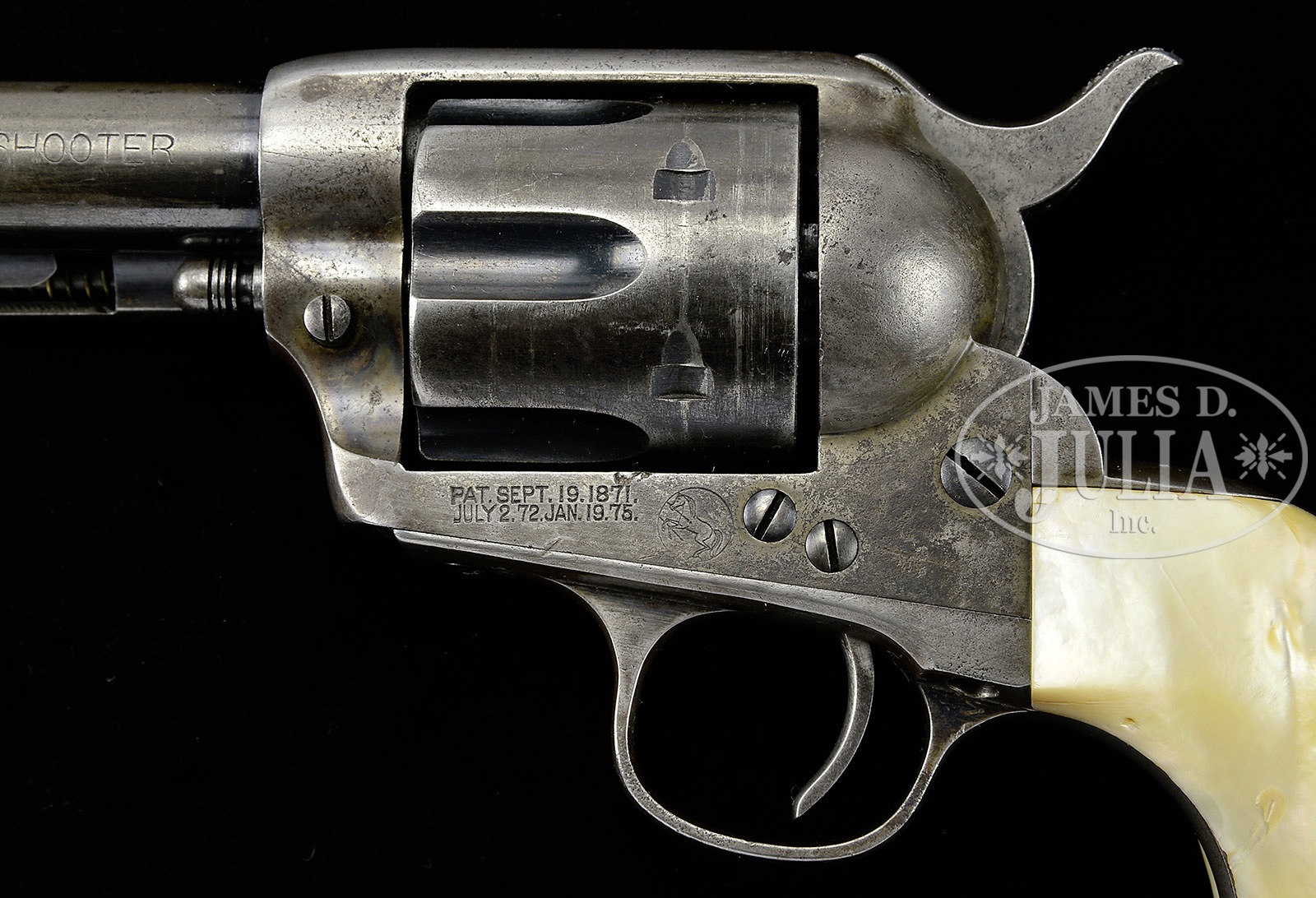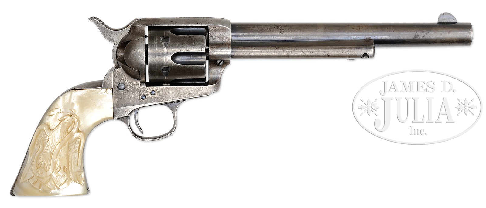 RARE MEXICAN NATIONAL RAILROAD MARKED COLT FRONTIER SIX SHOOTER SINGLE ACTION ARMY REVOLVER.SN 174271. Cal. 44 WCF (44-40). Blue & color case hardened with 7-1/2″ bbl, full front sight and block letter address with “COLT FRONTIER SIX SHOOTER” roll marked on left side. Bottom of bbl has a tiny “44” under base pin. Left side of frame has 2-line 3-patent dates and rampant Colt in a circle. Mounted with 2-pc pearl grips with a very deep, raised carved Mexican eagle on the right side. Accompanied by a Colt factory letter which identifies this revolver in caliber 44-40 with 7-1/2″ bbl, blue finish, type of stocks not listed, factory engraved: “Yes – Mexican National RR on backstrap”, shipped to Mexican National Railroad, c/o J.M. Nixon, address unavailable, on Nov. 23, 1897 in a 3-gun shipment. Non-standard markings such as this on Single Actions are quite rare and when encountered are usually not factory applied. PROVENANCE: Tommy Rholes Estate Collection. CONDITION: Very good to fine. Bbl retains 40-50% orig blue in sheltered areas, mostly around front sight and ejector housing with the balance a blue/gray patina; frame retains strong case colors in bottom front gullets with traces of silvered case colors, being mostly a gray metal patina; hammer retains traces of faded case colors; trigger guard & back strap are mostly a gray metal patina; cylinder retains strong blue in the flutes with the outer diameter a blue/gray patina. Grips have a chipped right heel and another chip on the right side at the frame with part of the snake missing above the eagle’s head, otherwise grips are sound showing great fire with strong colors on left side. Hammer is not solid in half cock notch, otherwise mechanics are fine; bore has a small pit, possibly a small ring near the muzzle. 4-50710 JR83 (12,500-17,500) – Lot 1214