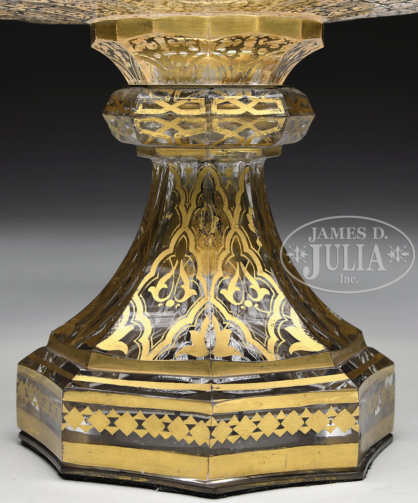 FRENCH PEDESTAL CENTER BOWL.Large French center bowl has a faceted octagonal pedestal with gold Islamic inspired decoration. The pedestal supports the large center bowl with matching gold decoration and a row of oval windows surrounding the side of the bowl. SIZE: 9″ t x 16-1/2″ dia. PROVENANCE: George Klabin Collection. CONDITION: Very good to excellent with some minor wear to decoration. 5-67507 (1,500-2,500) – Lot 1215