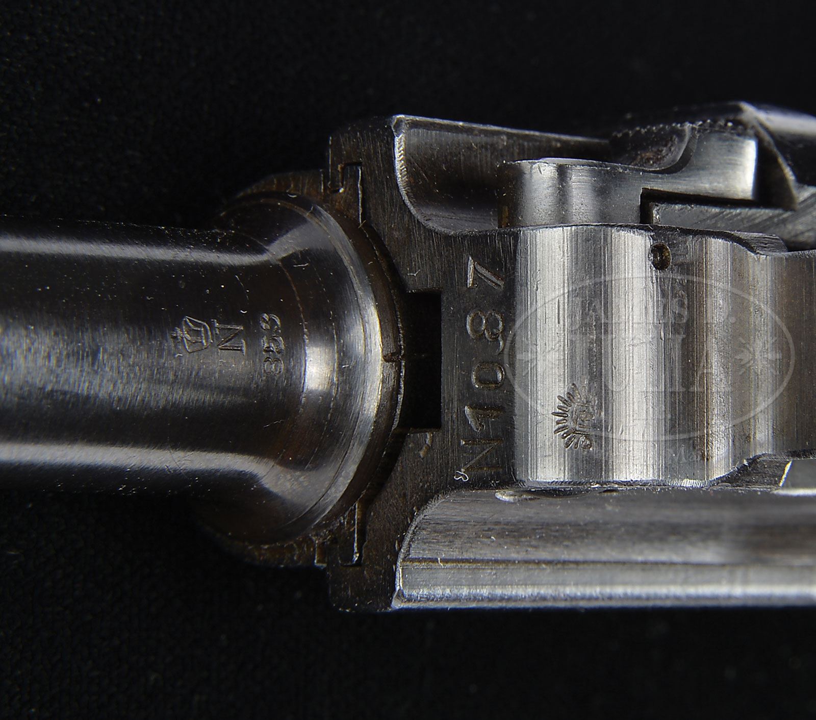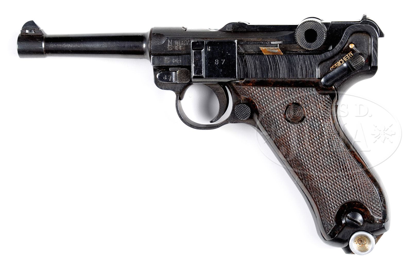 *VEB ERNST THALMANN MANUFACTURE EAST GERMAN POLICE LUGER WITH MATCHING MAGAZINE.SN N1087. Cal. 9mm. 4″ (DDR) Crown/N proofed bbl with DDR proof date 853 (August 1953). Full SN over DDR State/Eagle and (DDR) Crown/U proof on left receiver. Breechblock has old numbers that are etched out. Middle and rear toggle link have (DDR) Crown/U proofs and matching SN. East German eagle and Crown/U proof on left frame rail. Matching numbers on trigger and takedown lever. Full matching number on front of frame. No lanyard loop on rear. No milled well on back of frame. Red dot in lower safety position. “GESICHERT” marked on upper position. No stock lug. Checkered brown plastic grips with concentric circles. Orig matching numbered aluminum bottomed mag with machined aluminum body stamped “2-1001”. One of very few (reportedly less than 100) new manufactured pistols produced in the old Haenel plant (VEB Ernst Thalmann) in 1953 that utilized the orig Krieghoff tooling to make a number of new parts, that differ in detail from WWII production components. This gun is featured on p. 804 of Borchardt & Luger Automatic Pistols by Joachim Gortz and Dr. Geoffrey Sturgess. PROVENANCE: Collection of Dr. Geoffrey Sturgess. CONDITION: Very fine, retaining 98% orig blue with light wear on sharp edges. Grips are sharp with orig bright finish. Mag has 98% blue on body and very little wear on aluminum bottom. Bore is bright with light wear. Mechanics are excellent. 4-53002 BWS7 (4,000-6,000) – Lot 1216